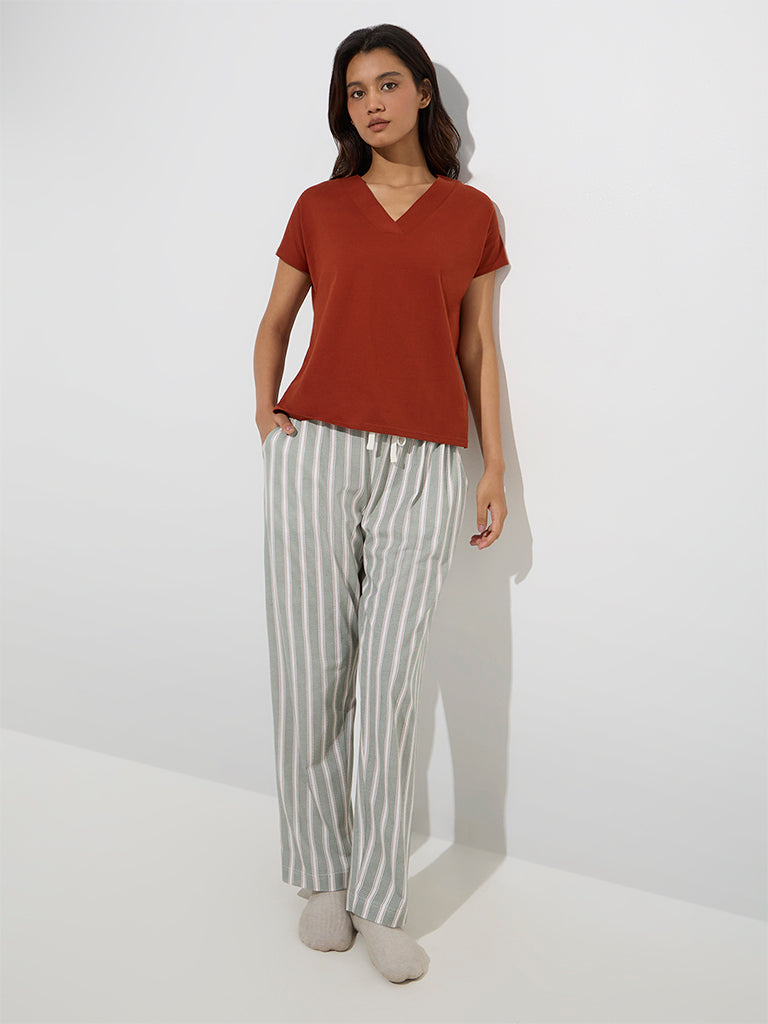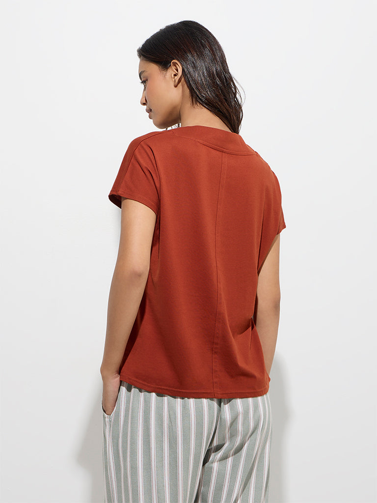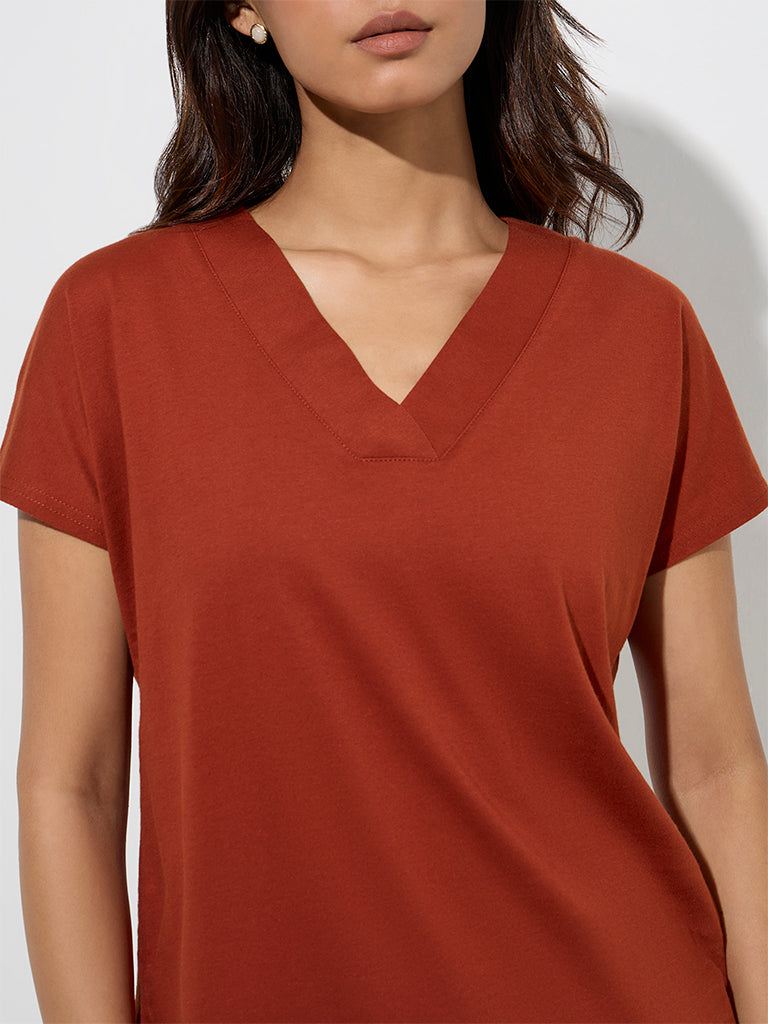 This rust solid top from Wunderlove is constructed from a premium fabric for a relaxed. airy feel. Featuring a V-neck and dolman sleeves. it pairs effortless comfort with understated style.