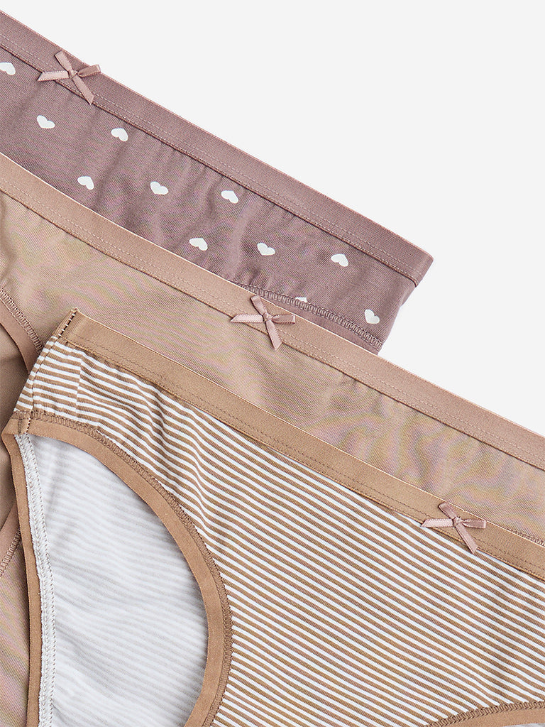 Wunderlove presents this set of briefs in elegant taupe gradients. featuring three versatile designs—solid. striped. and heart-patterned. Crafted from a soft cotton-blend fabric. each piece is designed with a smooth elastic waistband for a secure fit. ensuring lasting comfort throughout the day.