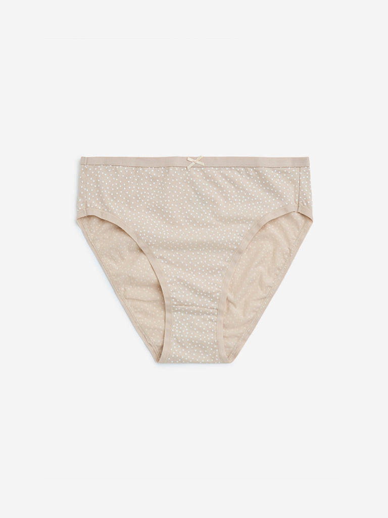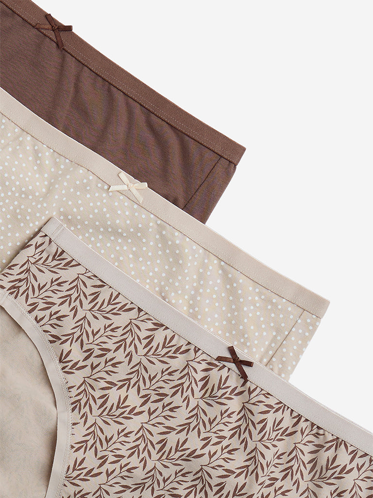 This pack of three full-coverage briefs from Wunderlove comes in earthy tones of taupe and beige. featuring a mix of polka dots. leaf prints. and a solid variant. Made from a premium cotton-blend fabric. each pair is designed with an elasticated waistband for a secure fit.