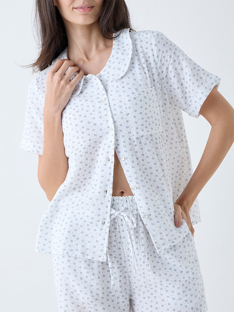 Make every lounge day feel charming with this white set from Wunderlove. adorned with dainty floral prints for a feminine touch. The shirt is styled with a sweet Peter Pan collar. a neat button placket. short sleeves. and a chest pocket. while the matching shorts feature an elasticated drawstring waistband and side pockets for effortless comfort.