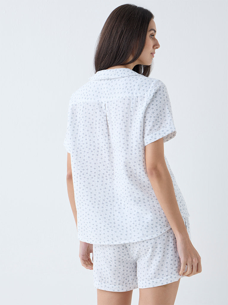 Wunderlove White Floral Design Cotton Shirt and Shorts Set