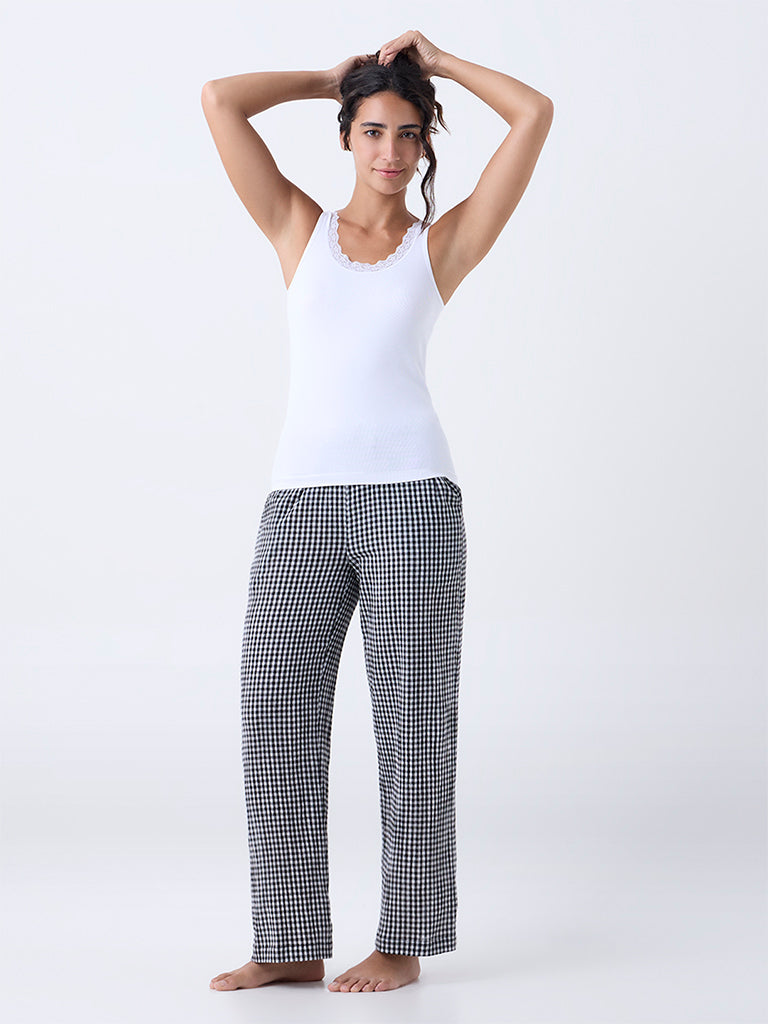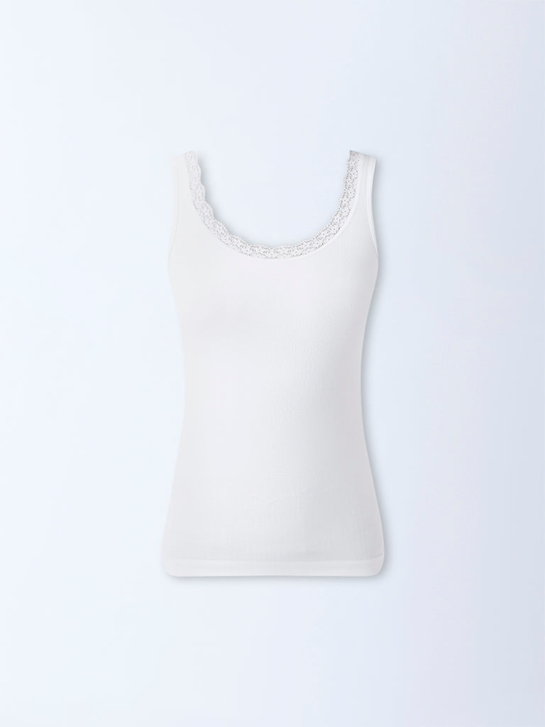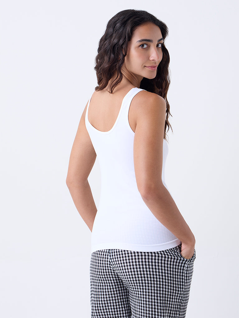 This white camisole from Wunderlove is styled with a round neckline edged with lace and a sleeveless silhouette for versatile wear. Crafted from soft fabric. it ensures comfort throughout the day while working as both a refined layering piece and a casual standalone style.