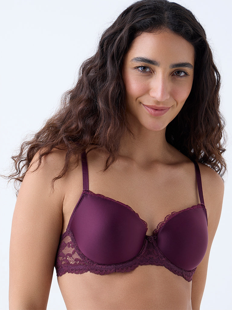 Wunderlove’s wine bra delivers everyday support with a more elevated feel. The floral lace detailing adds quiet elegance. while padded cups and underwired construction provide shape and gentle lift. Crafted from a sumptuous fabric that feels breathable against the skin. it’s finished with adjustable straps and a secure back fastening to hold the fit comfortably in place.