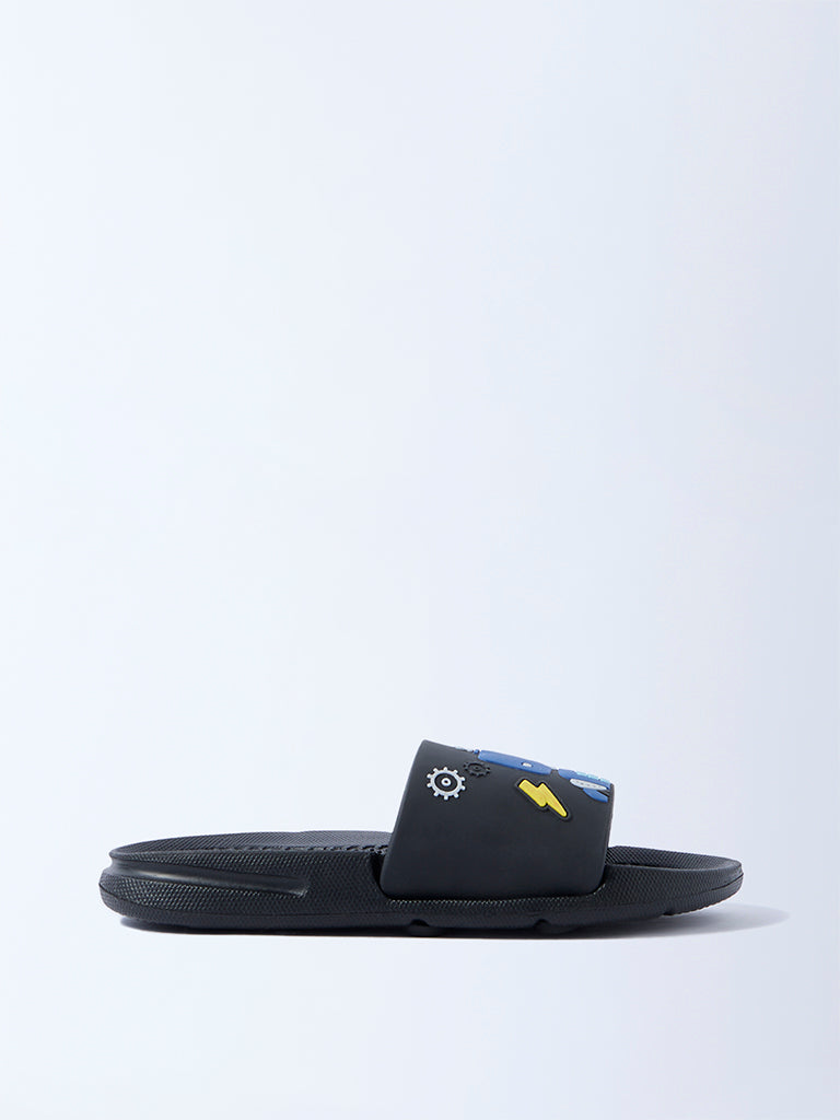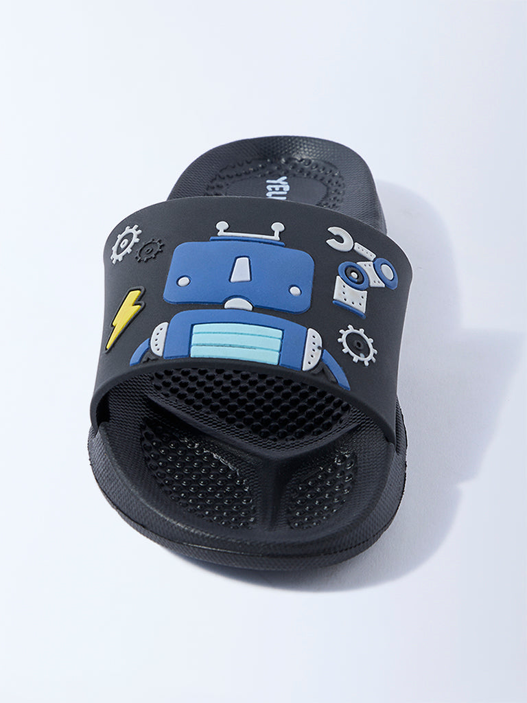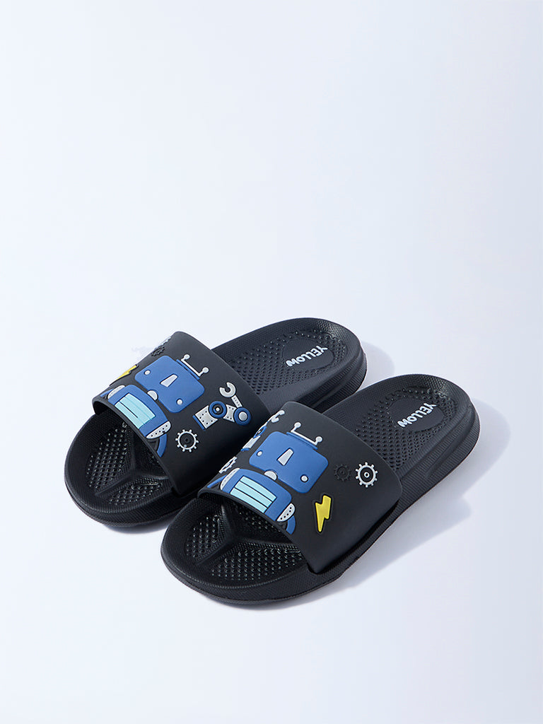 Yellow presents these black slides for a fun twist in everyday wear. Designed with bold robot motifs and bright colour accents. the pair brings a playful edge to off-duty dressing. Built with comfortable textured footbeds and gripped outsoles. they ensure comfort and steady support for all-day play.