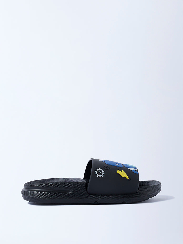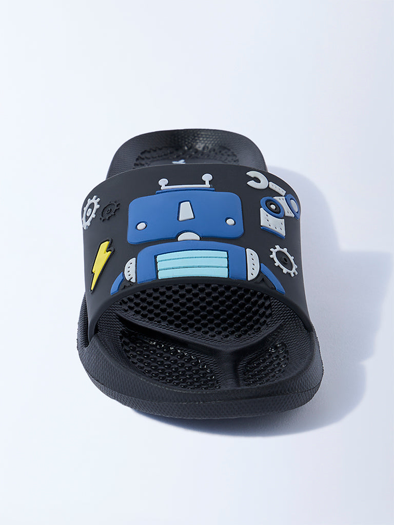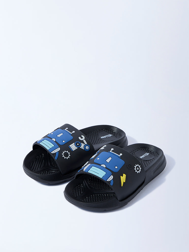 Yellow presents these black slides for a fun twist in everyday wear. Designed with bold robot motifs and bright colour accents. the pair brings a playful edge to off-duty dressing. Built with comfortable textured footbeds and gripped outsoles. they ensure comfort and steady support for all-day play.