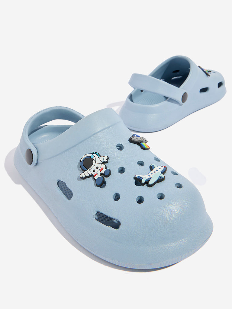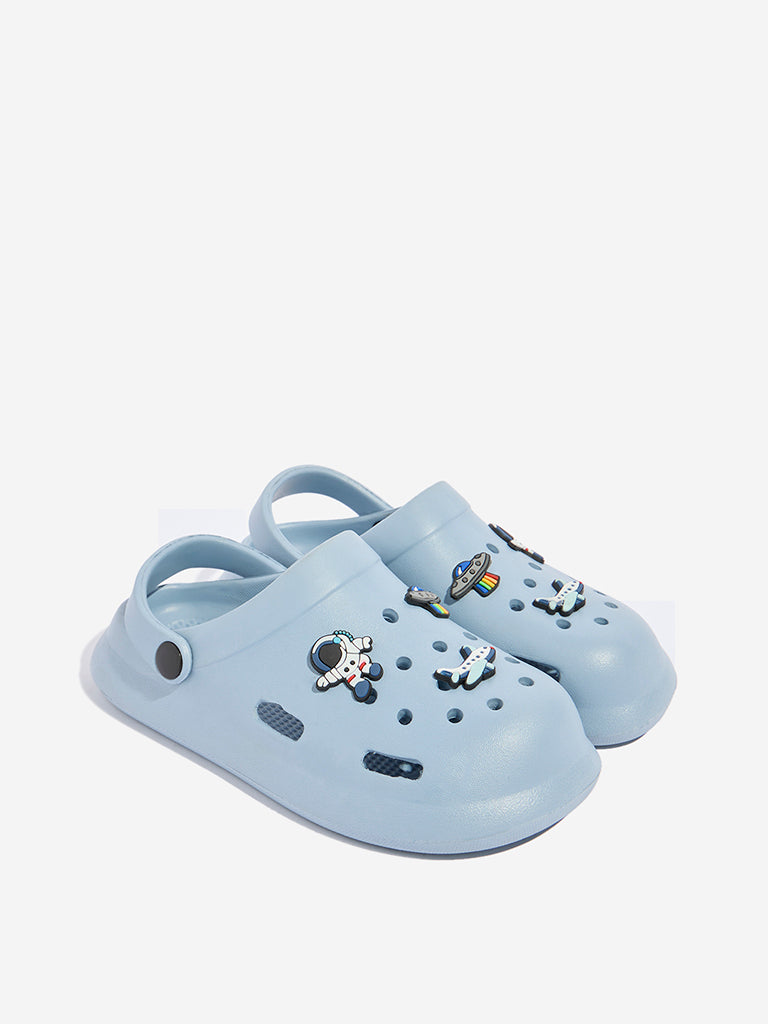 These blue clogs by Yellow feature a perforated design in the vamp along with cool space-themed applique detailing. Made with durable material. they boast a slingback addition for a quality fit. The footwear is completed with a soft insole and textured outsole for a comfortable experience.
