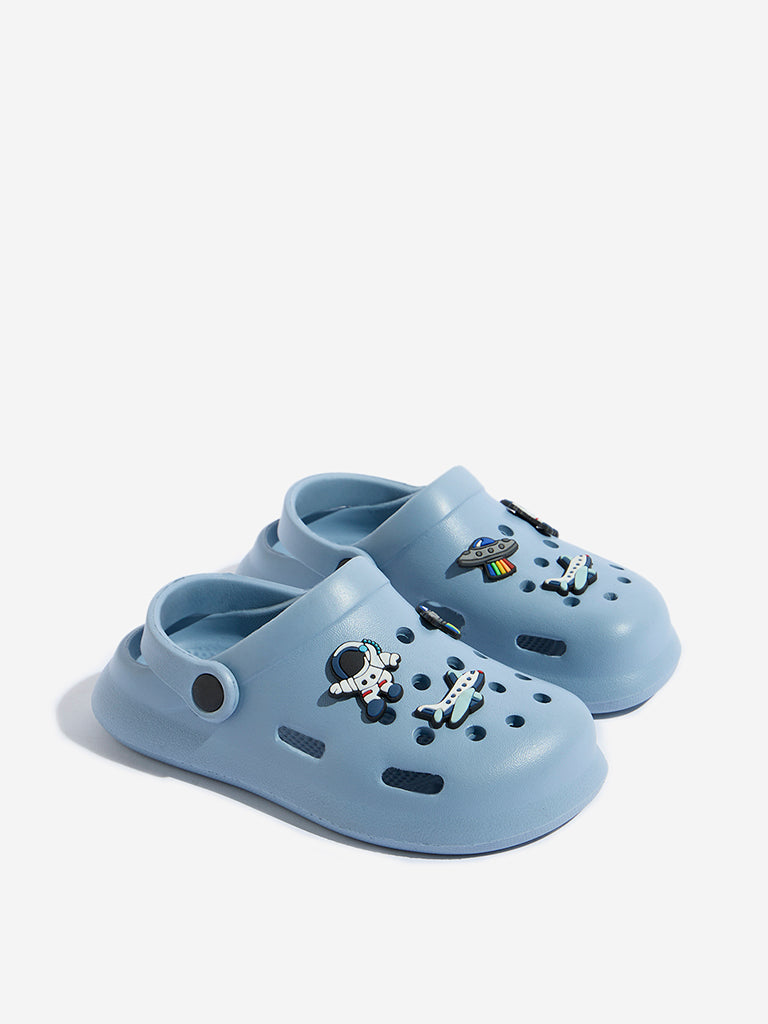 Yellow presents these blue clogs featuring captivating astronaut-theme applique detailing on its perforated vamp. Made from water-resistant material. it includes slingback addition. scooped insole and textured outsole for comfortable walking experience.