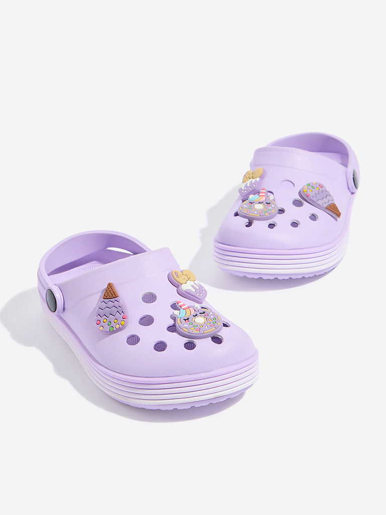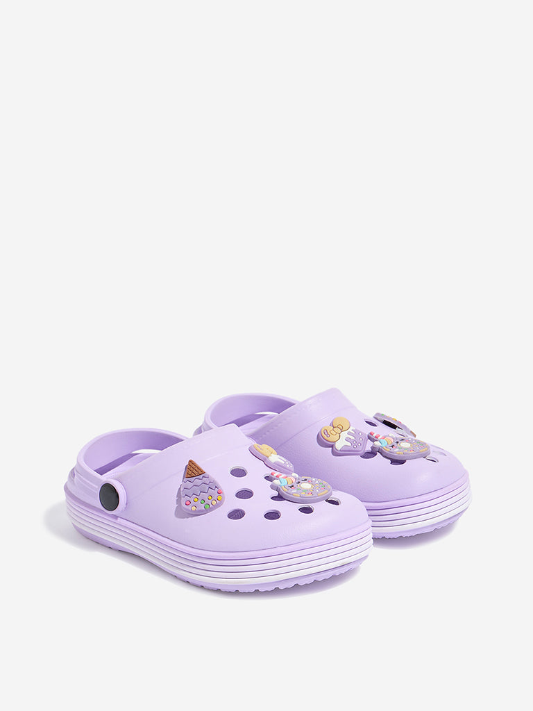 Yellow by Westside presents these lilac clogs with a perforated upper. adorned with charming applique detailing. Designed with a slingback for a secure fit. they feature a soft. cushioned insole and a textured outsole for supreme comfort.