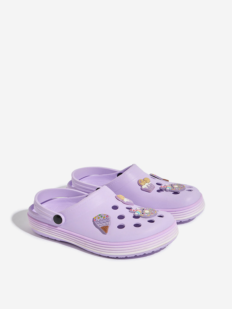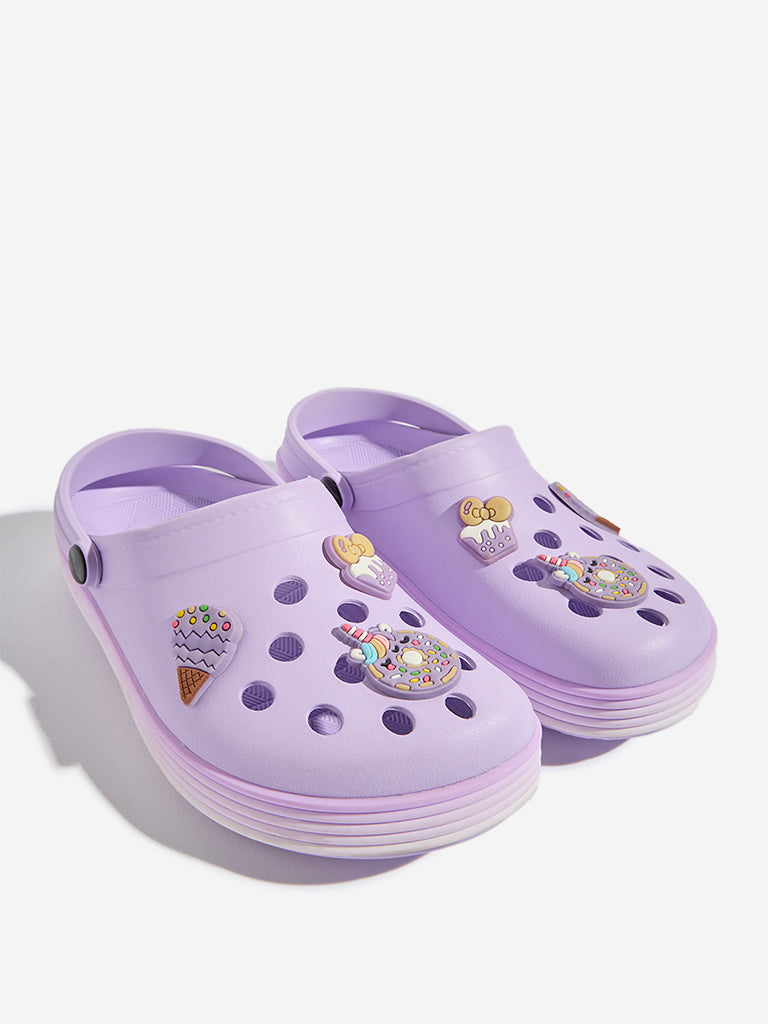Yellow presents these lilac clogs. featuring a perforated design with adorable applique detailing for a fun touch. The slingback strap ensures a secure fit. while the soft insole offers lasting comfort. Finished with a textured outsole. they provide grip for steady movement.