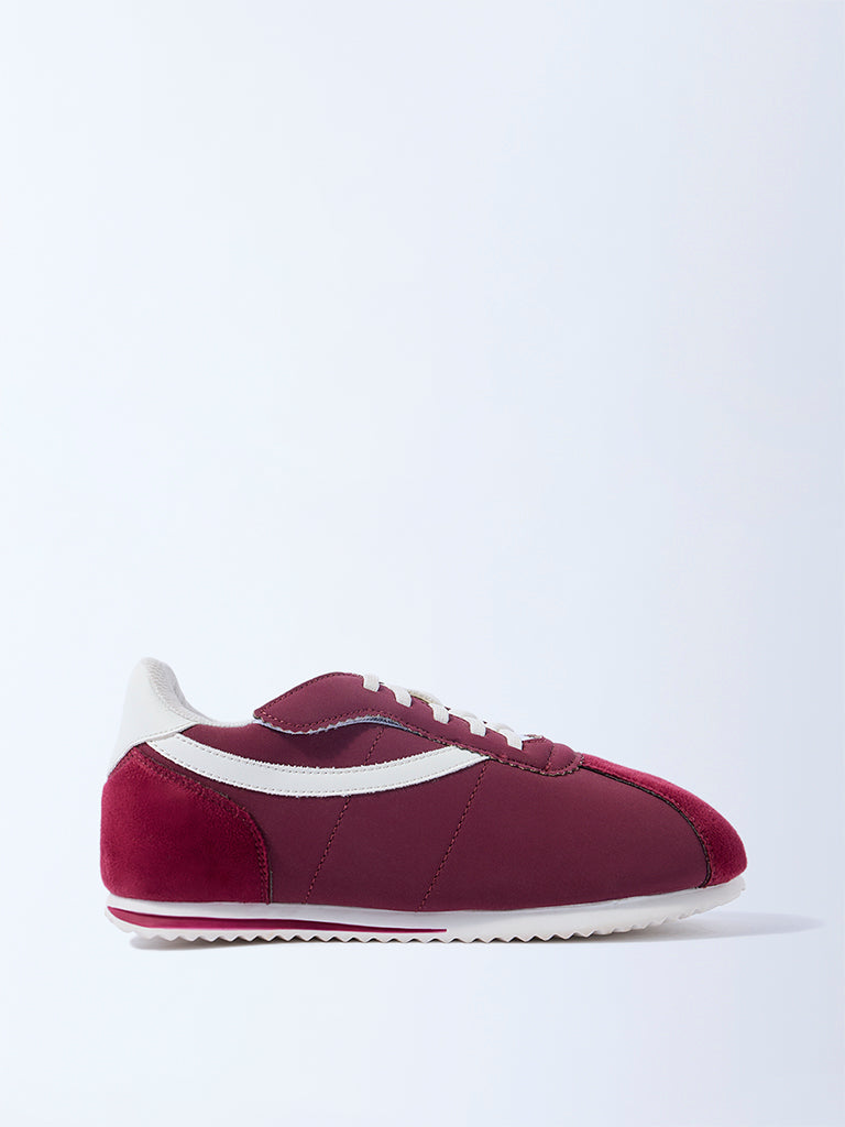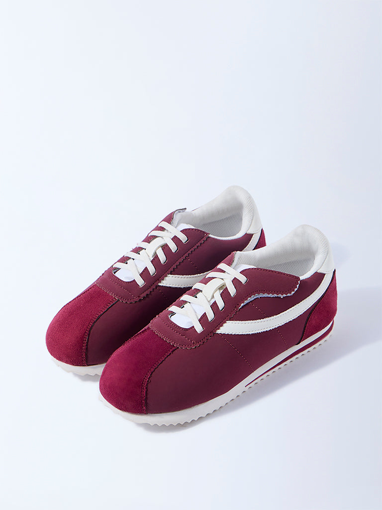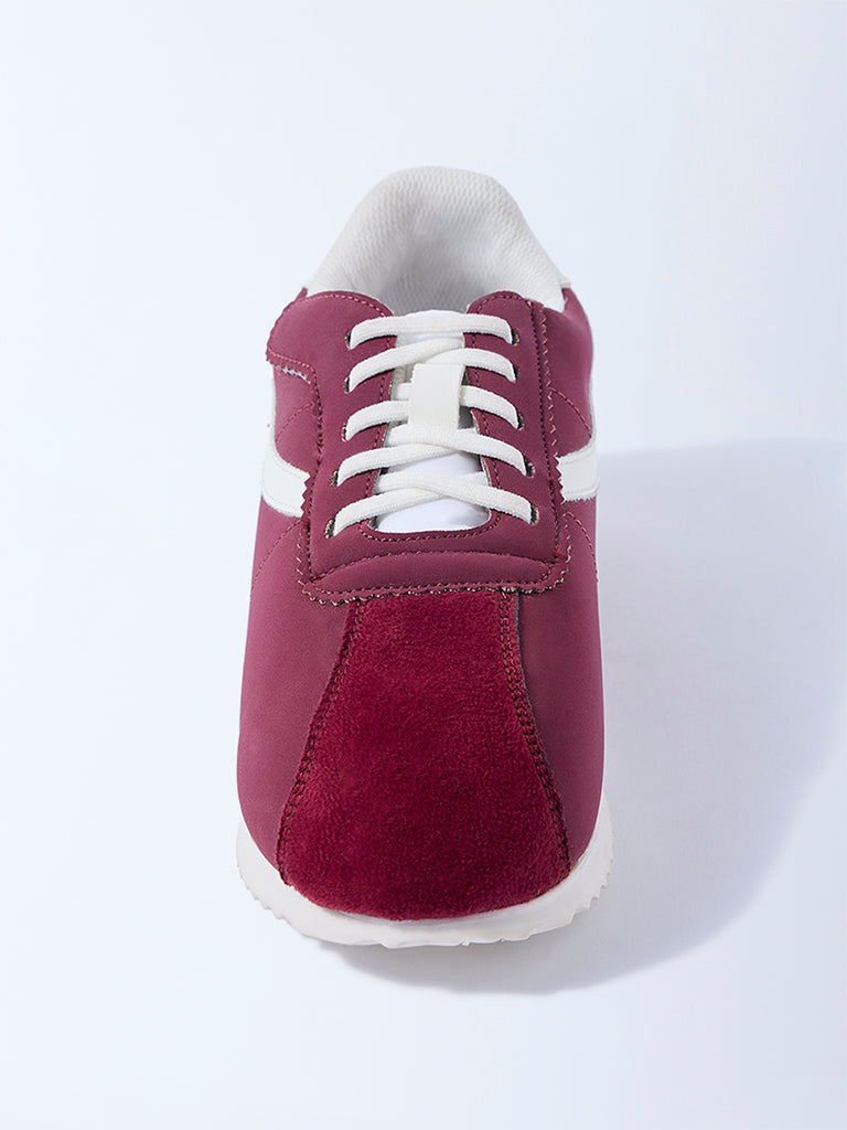 Sporty and stylish. these maroon sneakers from Yellow are designed with contrasting white stripe details for a modern edge. The lace-up fastenings ensure a secure fit. while the cushioned interiors deliver day-long comfort. Finished with textured outsoles for steady grip. they are a cool pick for active days and casual outings alike.
