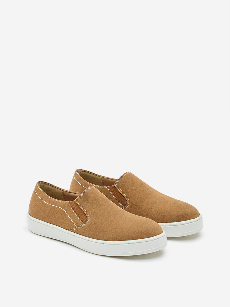 Yellow launches these mustard slip-on shoes with a faux suede finish on the exterior. Featuring elasticated detailing for easy wear. these slip-ons offer a soft insole. elevated midsole. and textured outsole for enhanced comfort and support throughout the day.