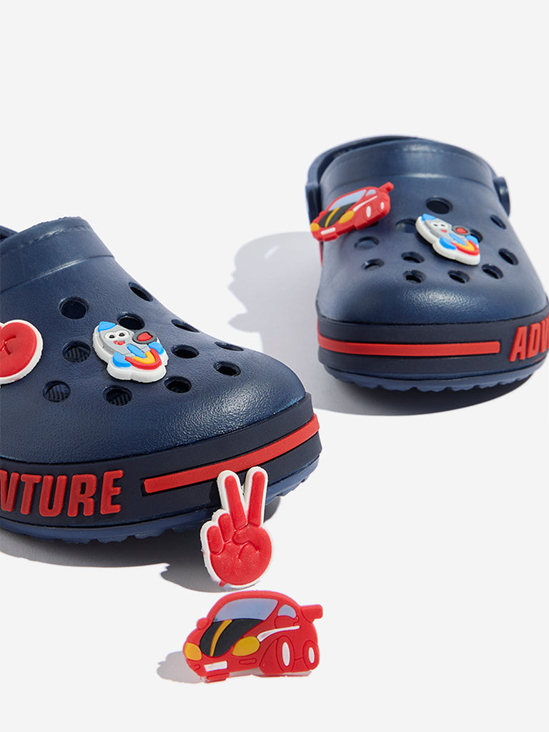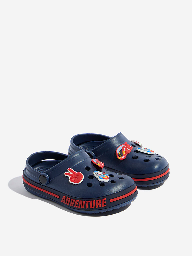Yellow launches these navy clogs. featuring a perforated upper adorned with playful camping-themed appliqué detailing. Designed with a secure slingback strap. they offer a cushioned insole for all-day comfort. while the textured outsole ensures enhanced grip and stability.