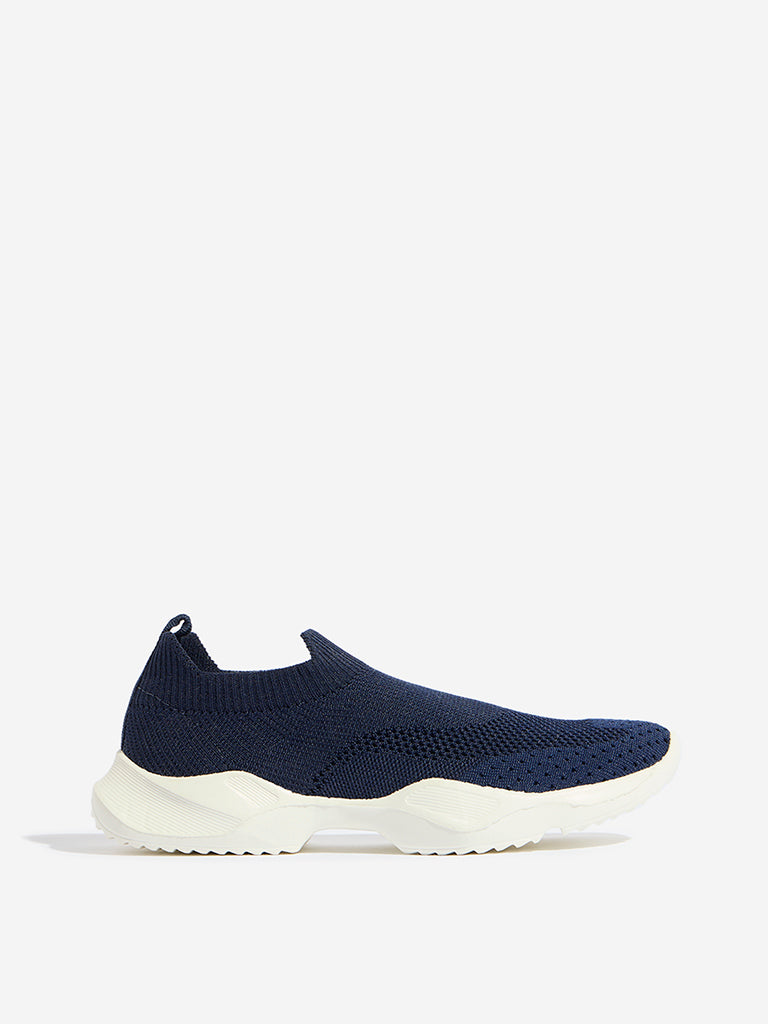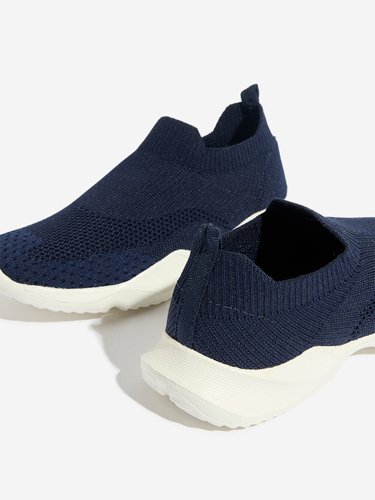 Yellow presents these navy shoes. designed with a stylish knit-textured exterior. Featuring a stretchable mouth for a secure fit. they offer effortless slip-on wear. The soft insole ensures comfort. while the textured. rubbery outsole provides flexibility and grip for easy movement.