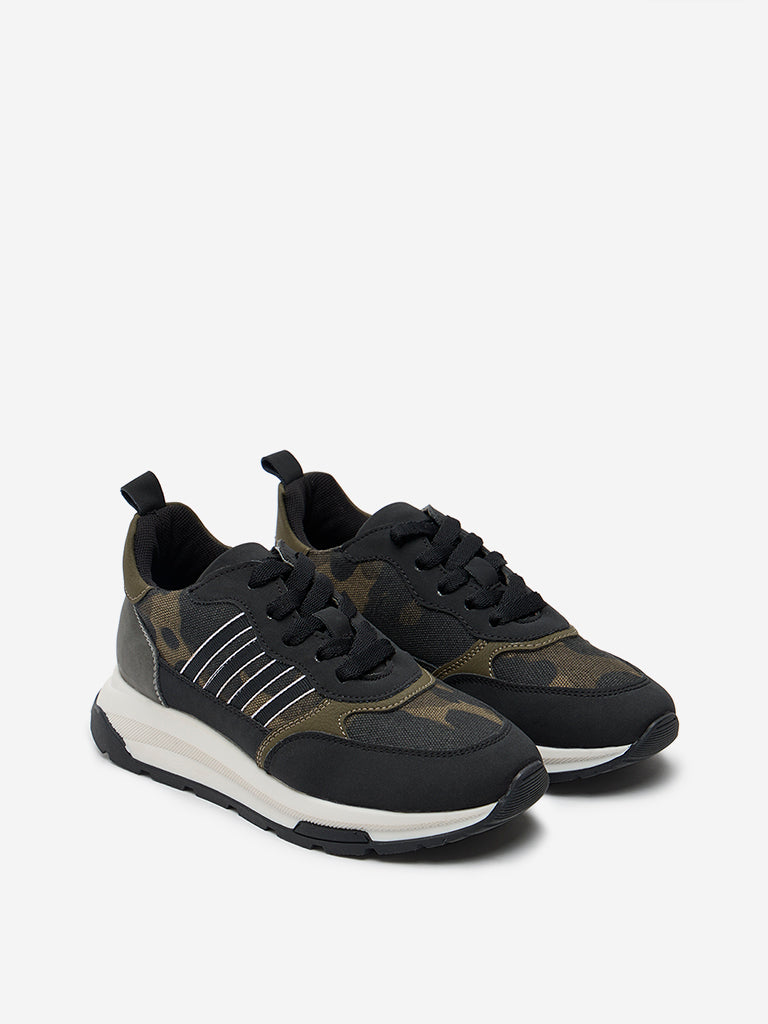 Yellow presents these olive sneakers showcasing a camouflage design on the exterior. These are built with a cushioned footbed along with a sturdy midsole and textured outsole for stability and grip.
