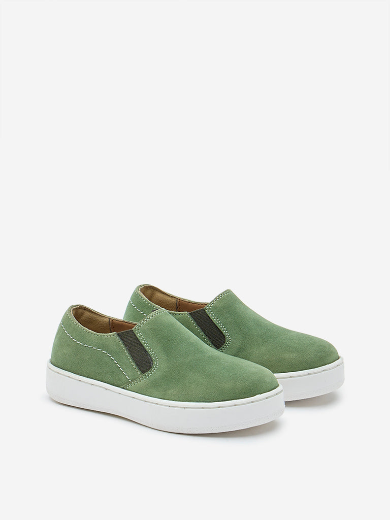 Yellow launches these olive slip-on shoes with a faux suede finish on the exterior. Featuring elasticated detailing for easy wear. these slip-ons offer a soft insole. elevated midsole. and textured outsole for enhanced comfort and support throughout the day.
