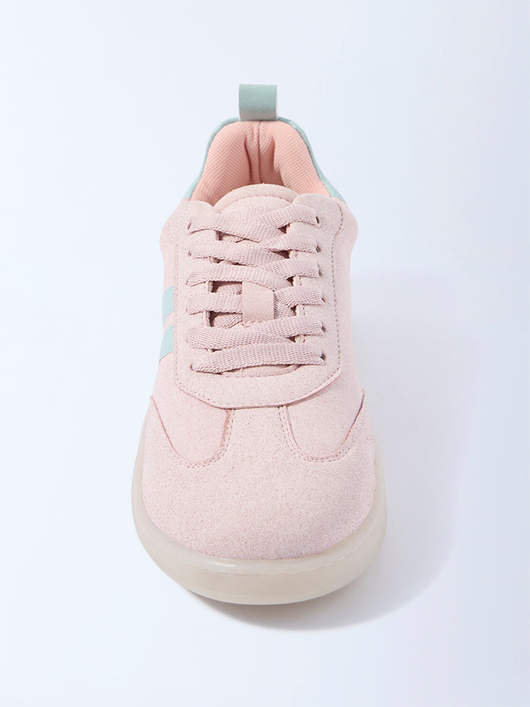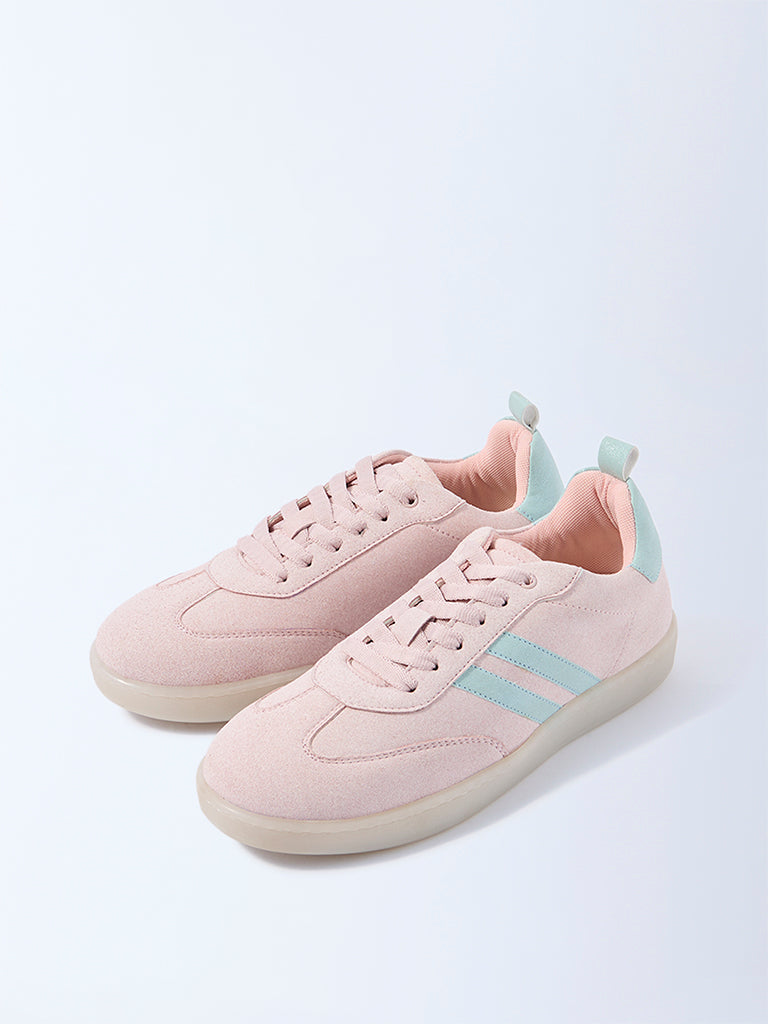 Playful yet practical. these pink suede sneakers from Yellow are accented with stripes and a heel detail for a fun pop of contrast. The cushioned sole ensures comfort with every step. making them a versatile pick to brighten up casual outfits and everyday adventures.