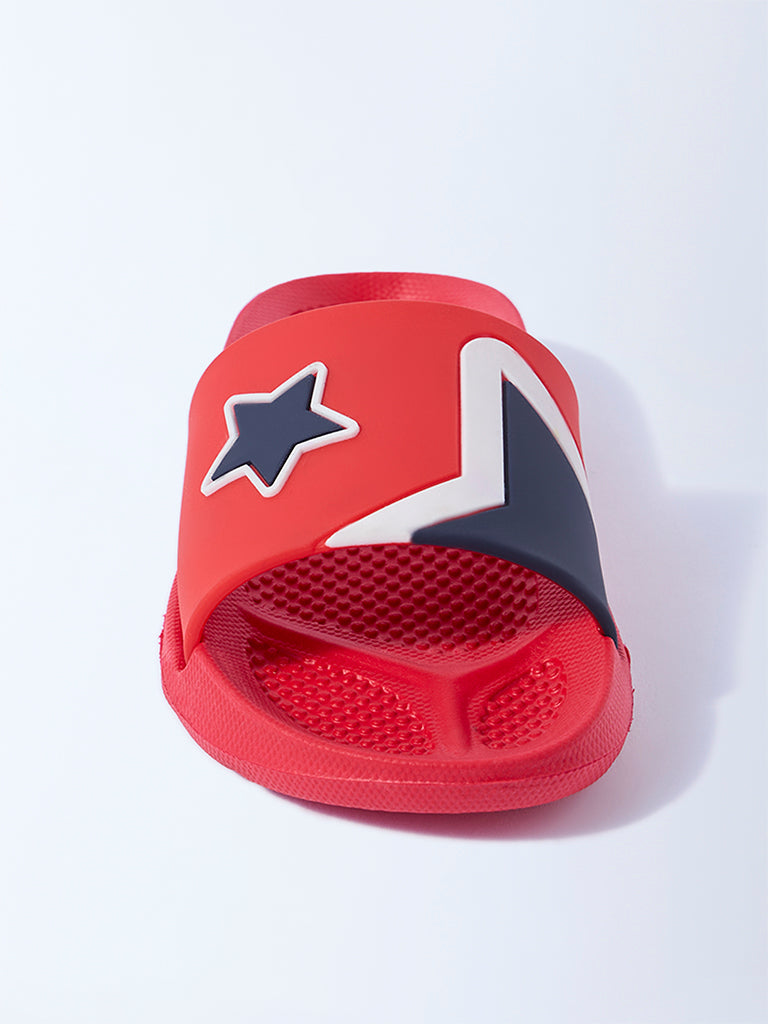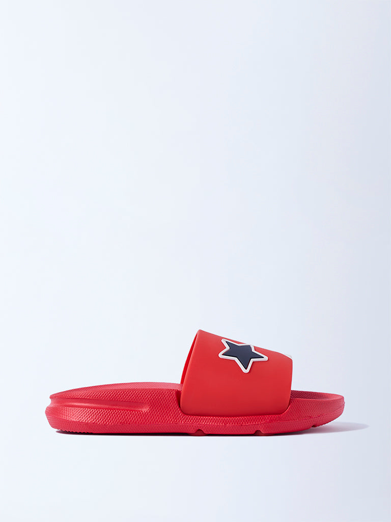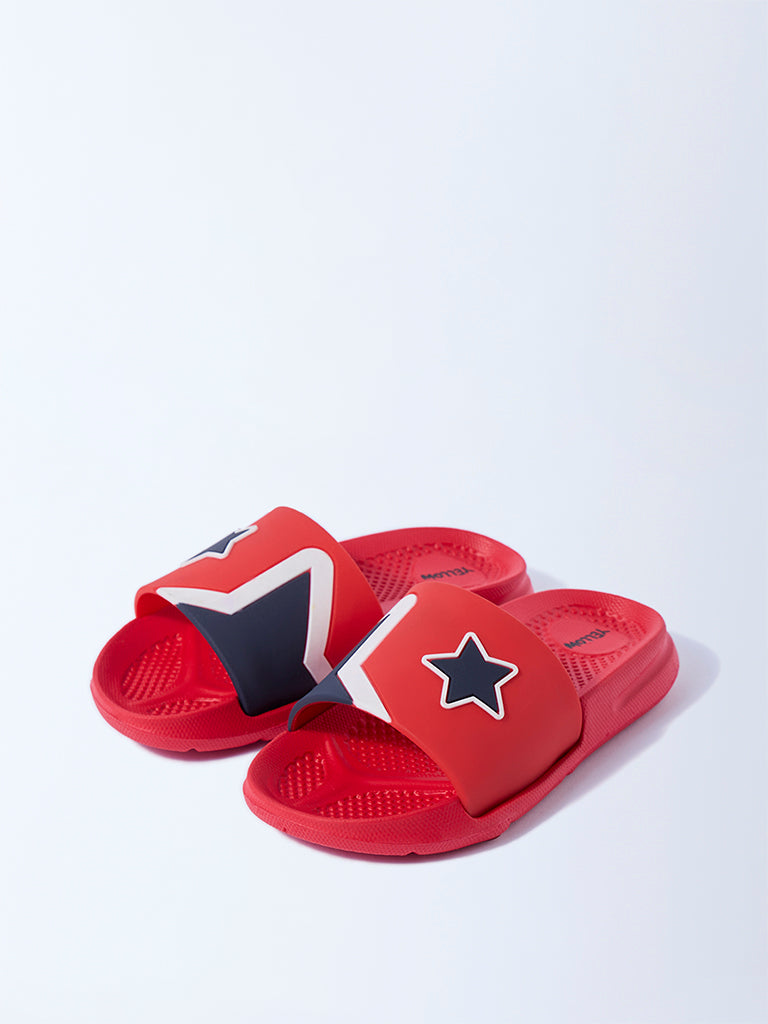 These red slides from Yellow bring a playful pop to their everyday style. Designed with bold star motifs across broad straps. the pair captures a sporty yet fun aesthetic. Set on soft textured footbeds and finished with gripped outsoles. they ensure comfort and steady footing through active days.