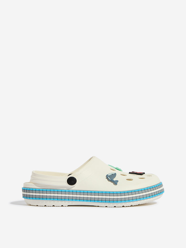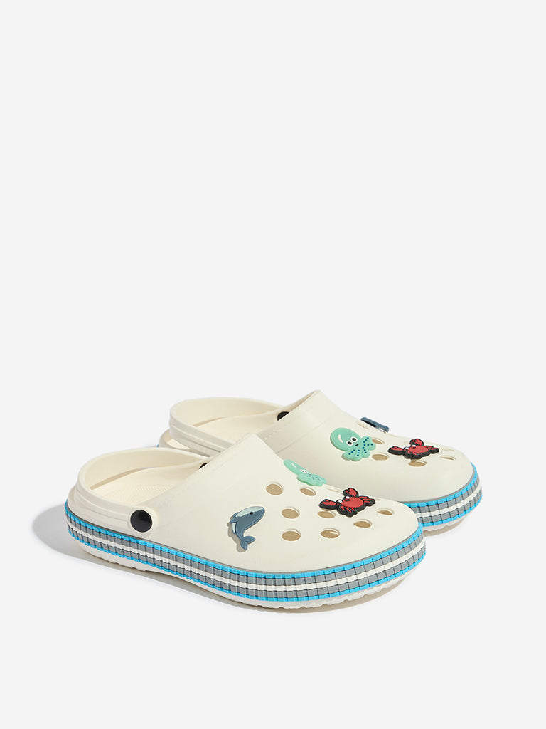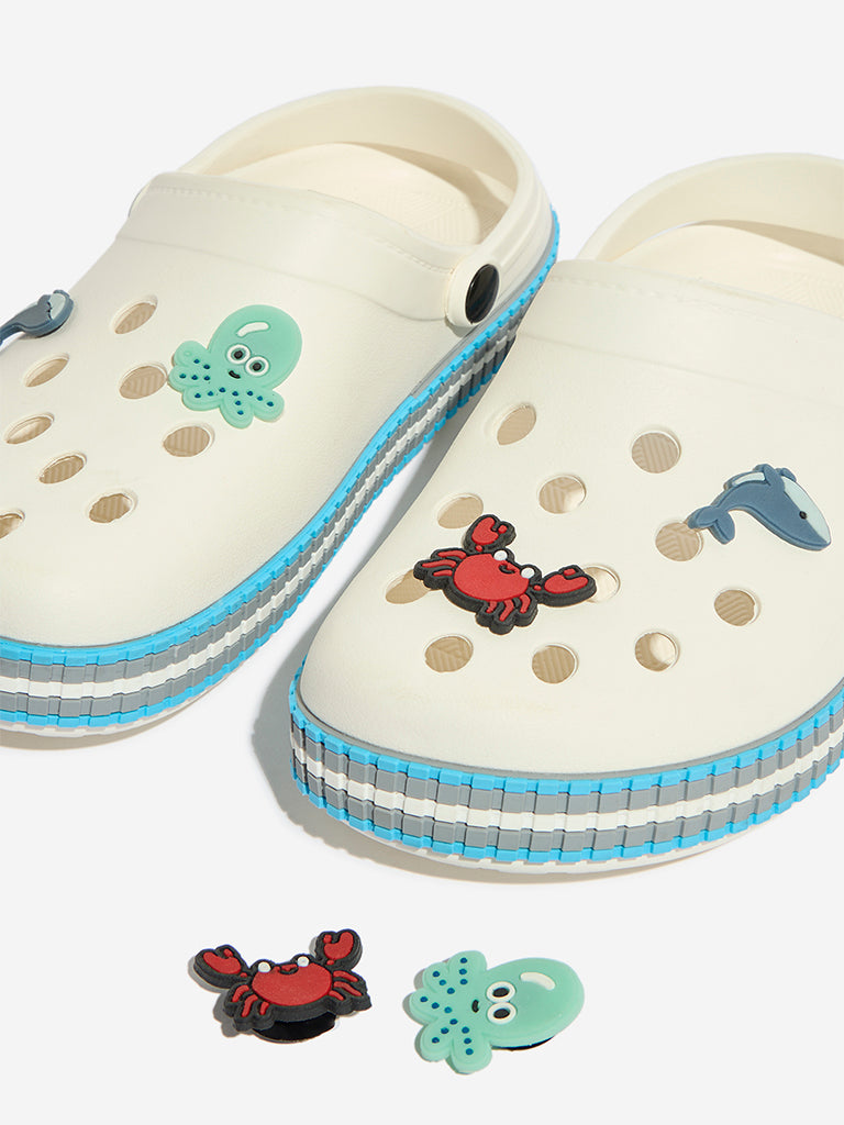 These white clogs from Yellow feature a perforated design with playful sea animal-themed appliques for a fun touch. The secure slingback strap ensures a snug fit. while the soft insole enhances comfort. Finished with a textured outsole. they provide stability and grip for easy movement.