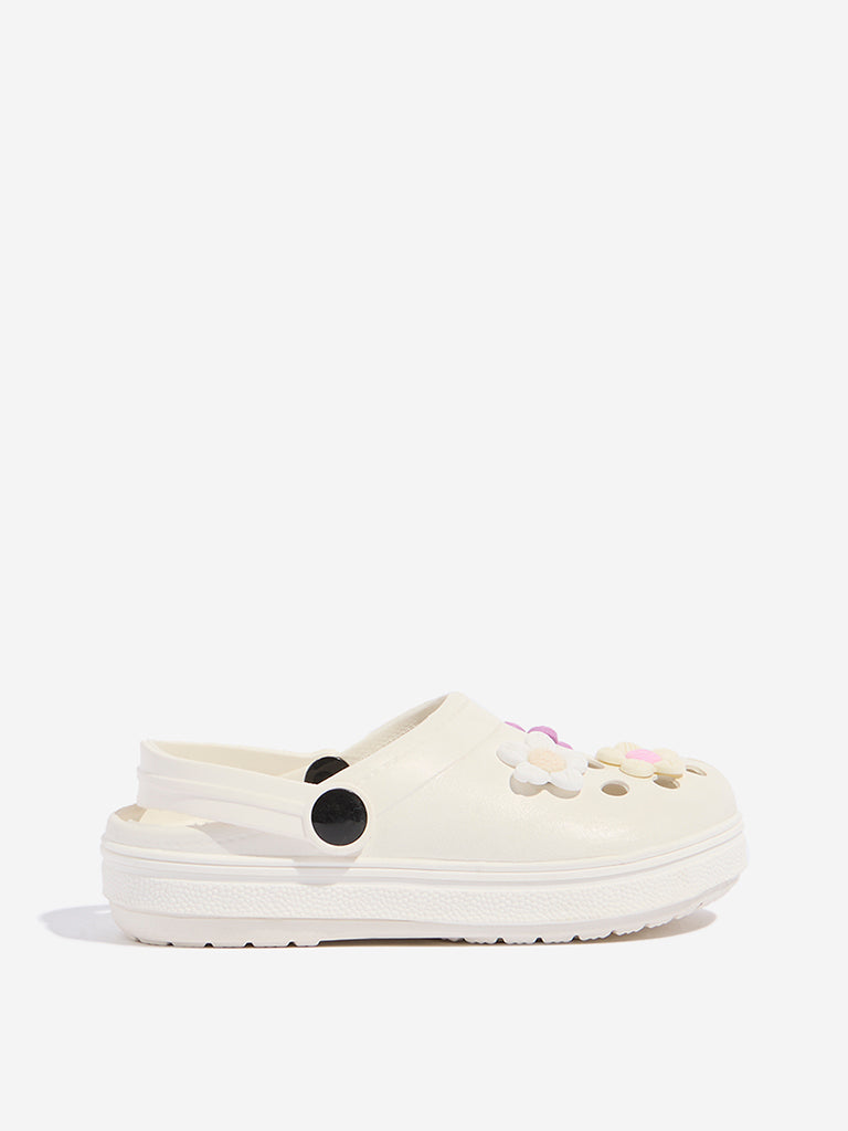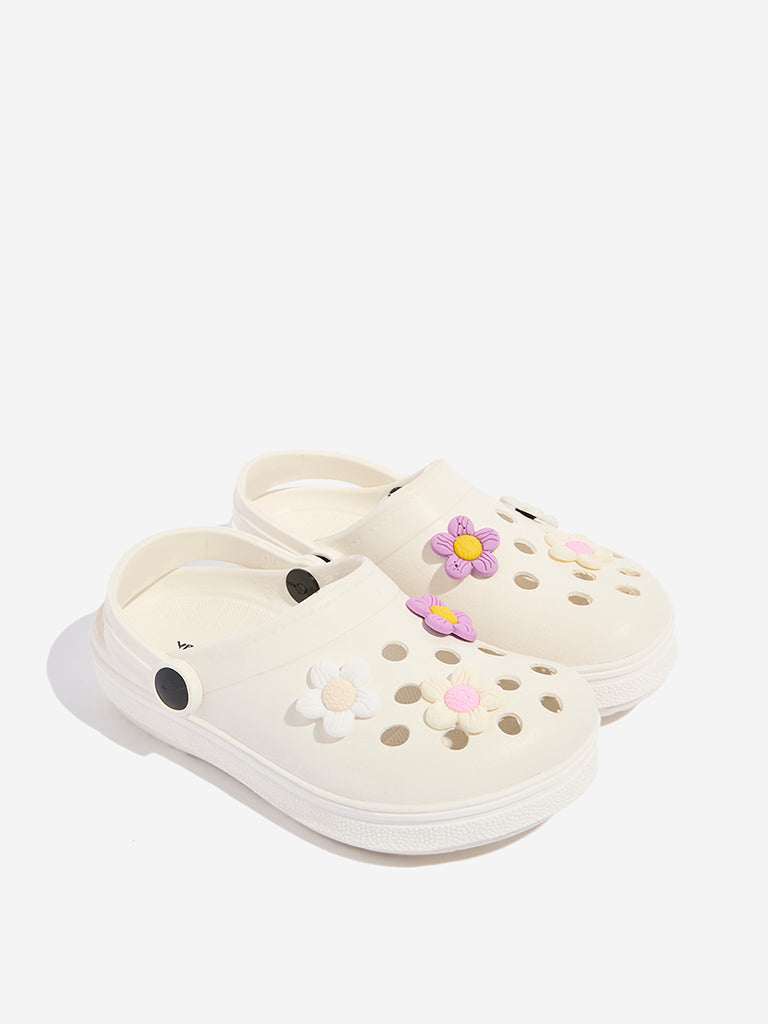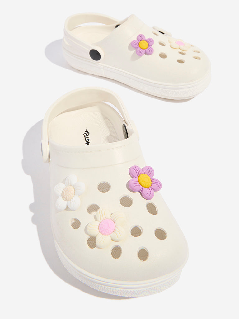 Yellow launches these white perforated clogs. designed with charming floral-themed applique detailing for a playful touch. The breathable perforated exterior keeps little feet cool. while the slingback strap ensures a secure and comfortable fit. Featuring a soft insole for added cushioning and a textured outsole for reliable grip. they are perfect for outdoor play or casual outings. Stylish and functional. they’re a must-have for your child’s footwear collection.