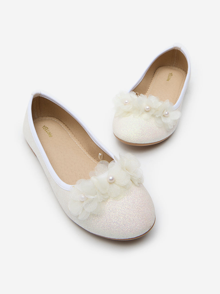 Elevate your style with the Yellow’s white shimmer textured ballerina. The footwear offers a round-toe silhouette adorned with exquisite pearl-topped floral detailing on the vamp. . Designed for comfort. they boast a soft insole and a textured outsole for excellent grip.