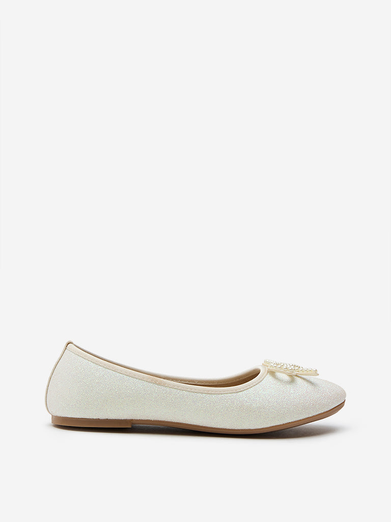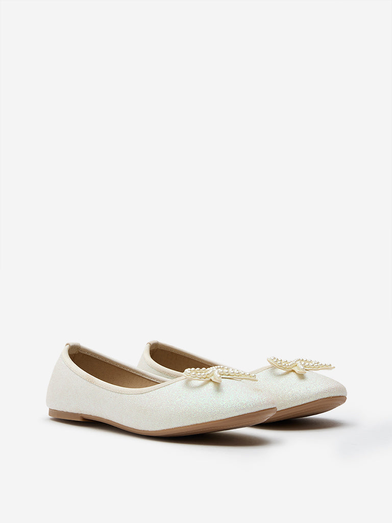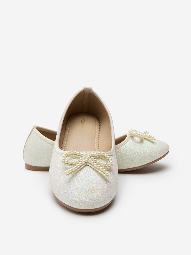 These white ballerina by Yellow are carved in an elegant round-toe silhouette boasting a shimmer-textured exterior and are beautifully adorned with a pearl ribbon on the upper. The soft footbed provides exceptional comfort. while the textured outsole ensures a great walking experience