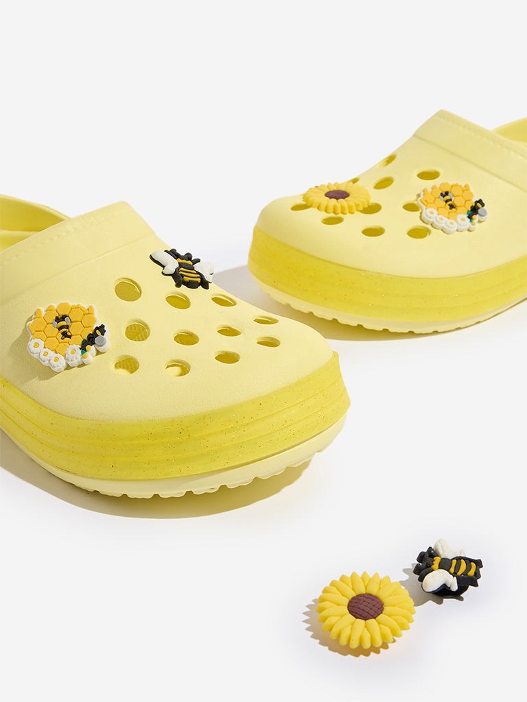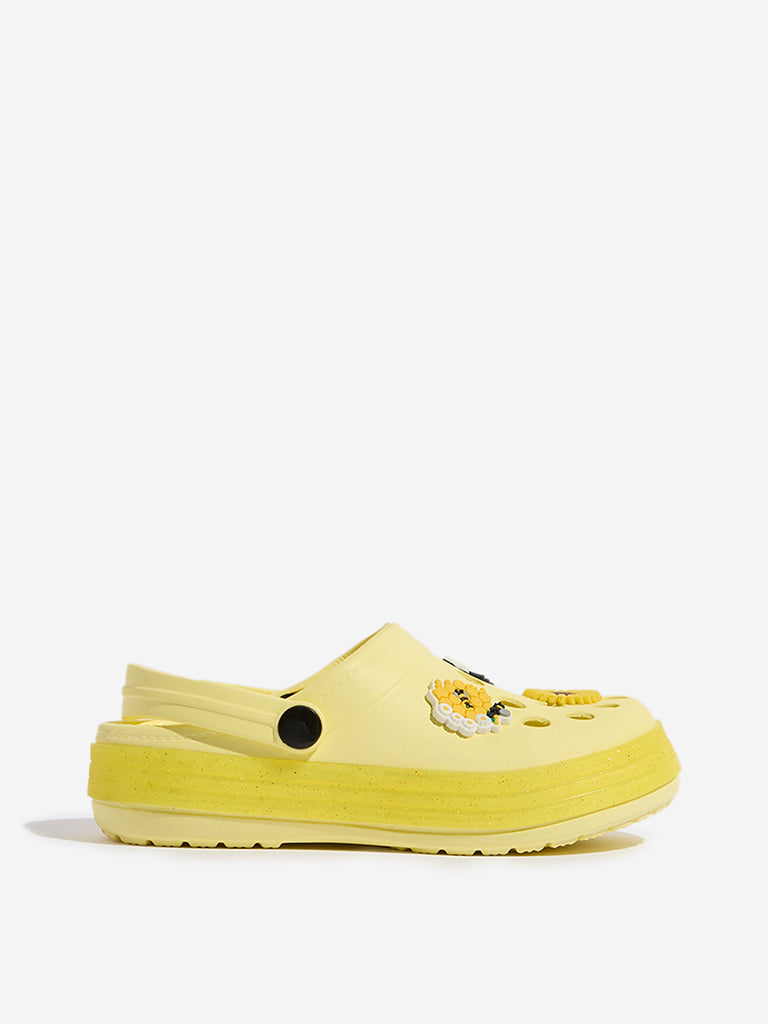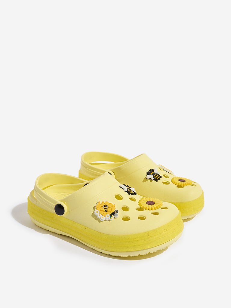 These yellow clogs by Yellow feature a perforated upper adorned with playful bee-inspired appliques. The slingback strap ensures a secure fit. while the soft footbed delivers comfort with every step. Finished with a textured outsole for added traction. these clogs effortlessly combine style and practicality.