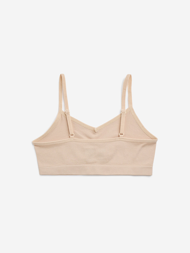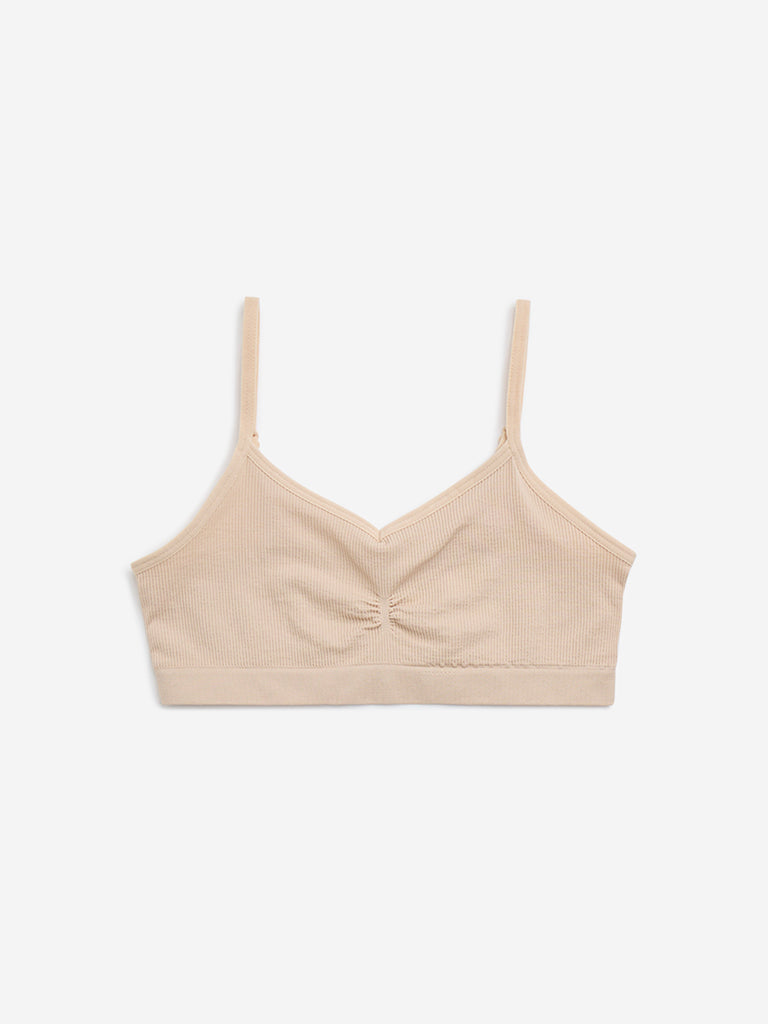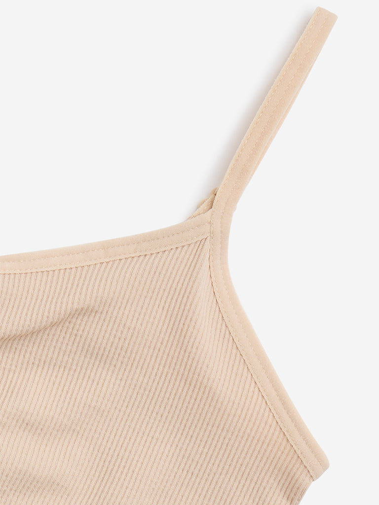 Y&F Kids launches this beige crop top in ribbed texture. Made with soft and stretchable fabric. it features slight ruched detailing. a V-neck. and a sleeveless cut. The elastic waistband ensures a secured fit.