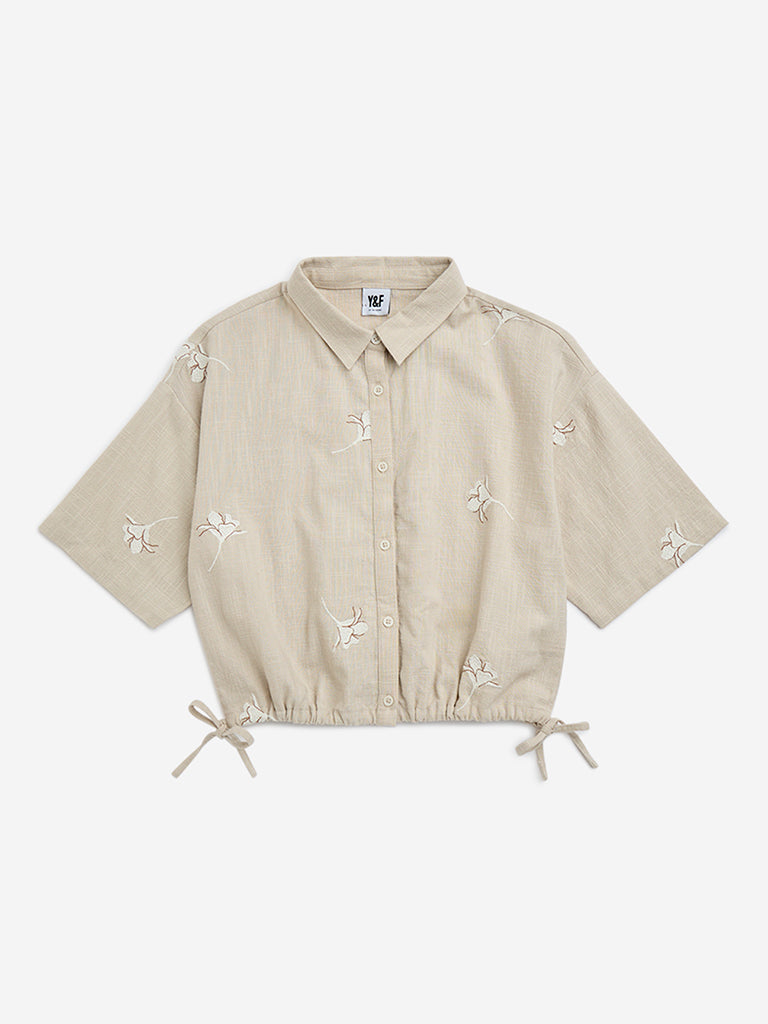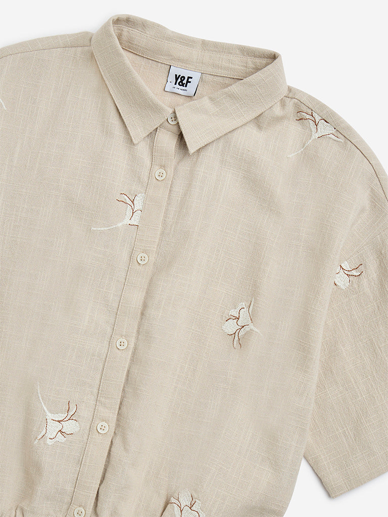 Y&F Kids presents this beige shirt. crafted from pure cotton and adorned with charming floral prints. Styled with an elasticated detailing at the waist for a snug yet comfortable fit. it features a structured spread collar. a button-up front. and short sleeves for a classic touch.