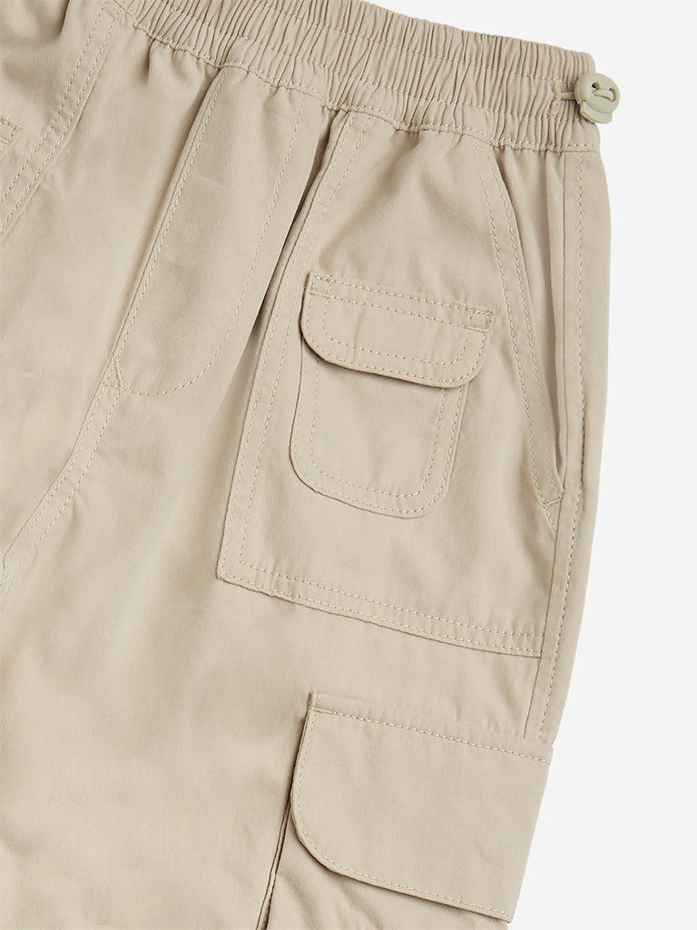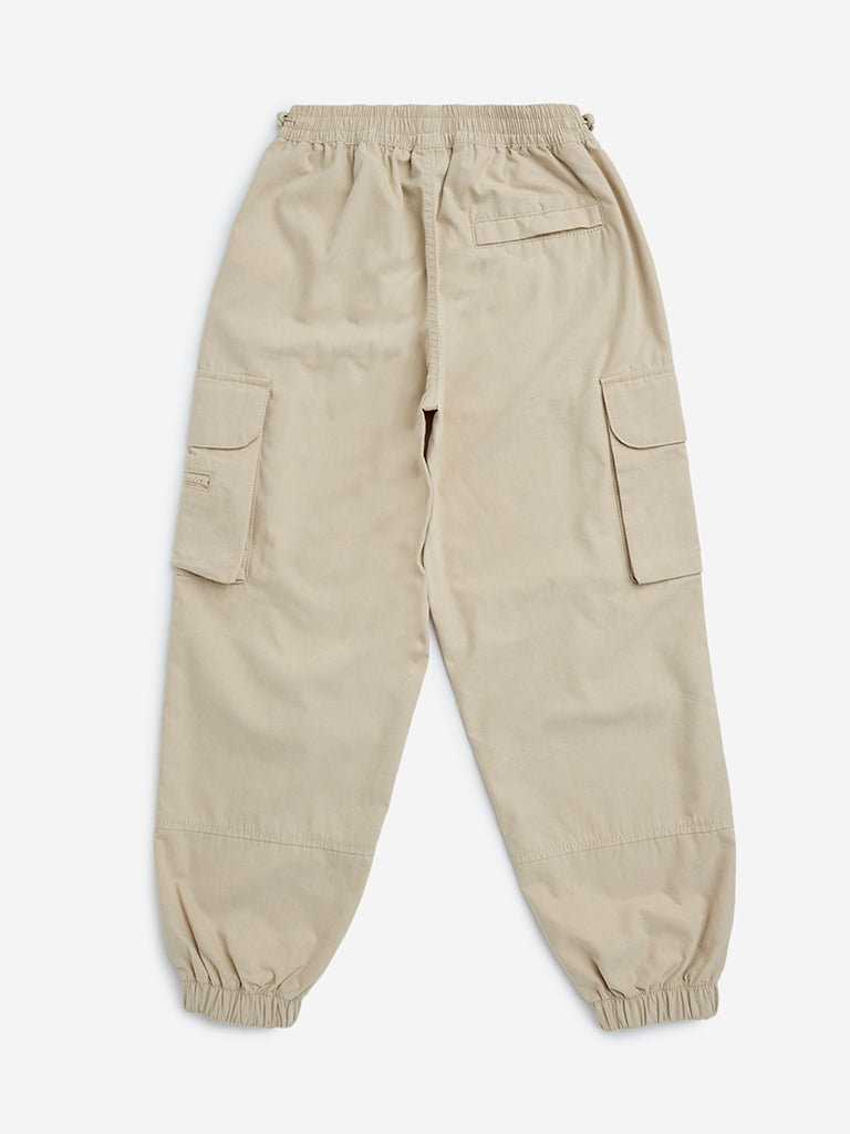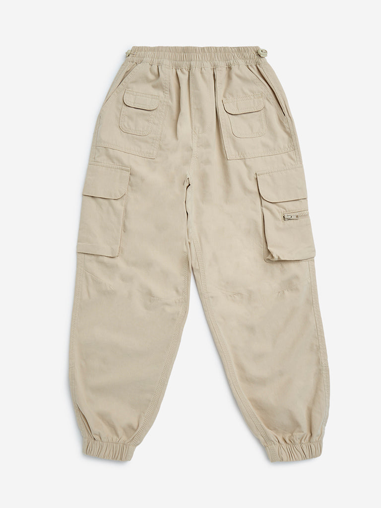 Y&F Kids brings these beige joggers. crafted from cotton-blend fabric for all-day ease. Built in a high-rise frame. the elasticated waist ensures a secure yet flexible fit. while multiple pockets add a touch of utility.