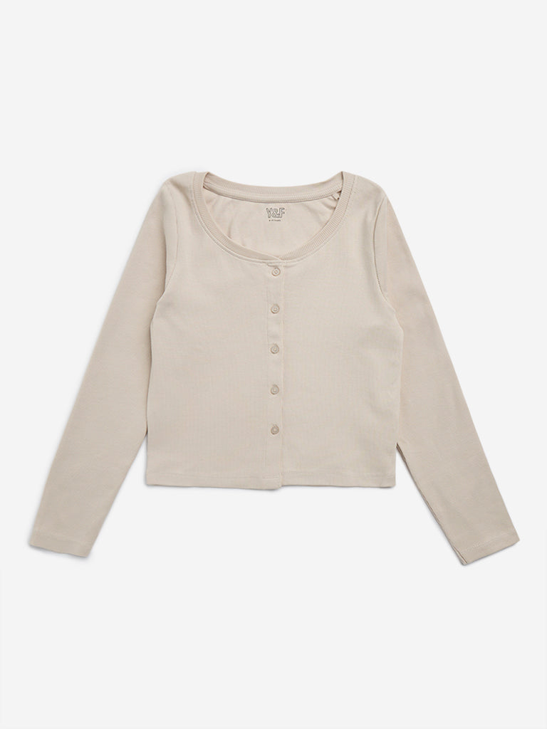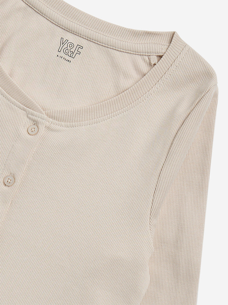 Y&F Kids launches this beige t-shirt in ribbed texture. Made with a cotton-rich blend. it includes scoop neck. button down style and full sleeves.