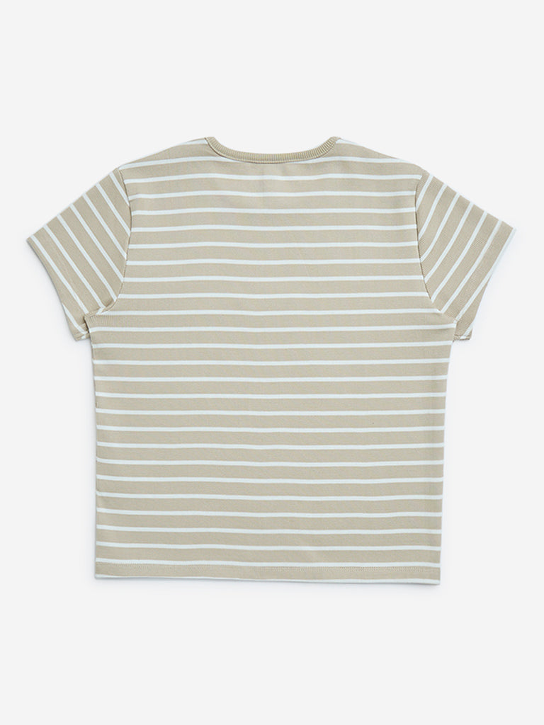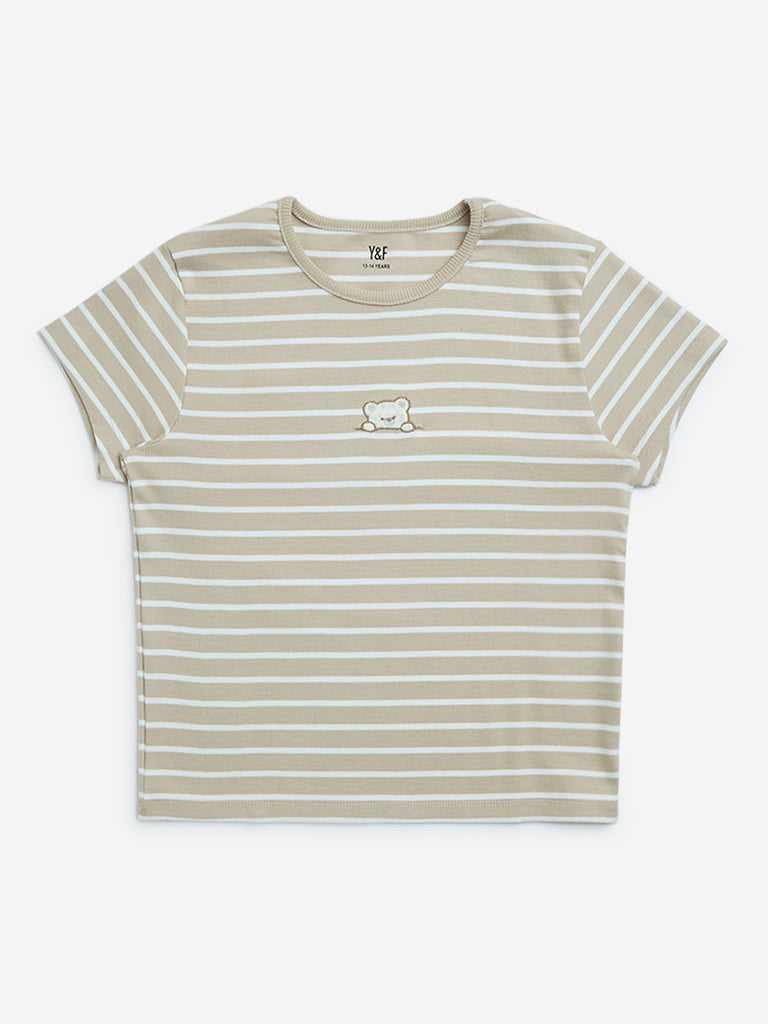 Y&F Kids Beige Stripe Printed Cotton-Blend T-Shirt