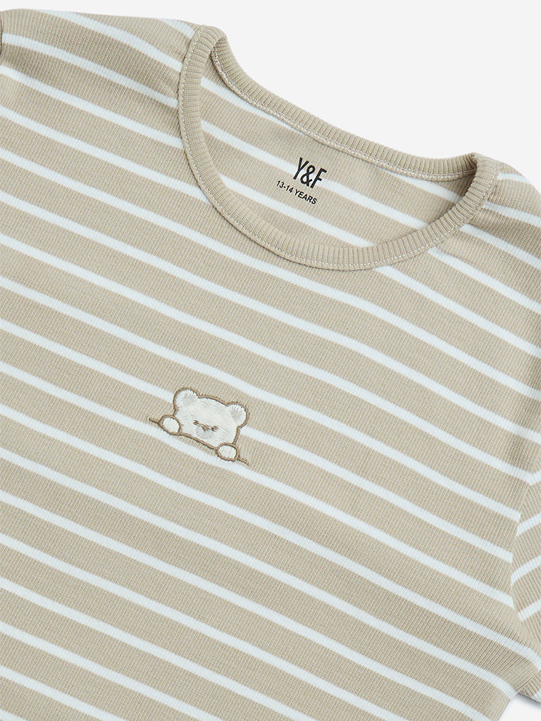 Y&F Kids introduces this beige tee. featuring playful stripe prints and a cute teddy detail. Designed with a crew neck and short sleeves. it’s crafted from a soft cotton-blend fabric. making it the perfect everyday essential.