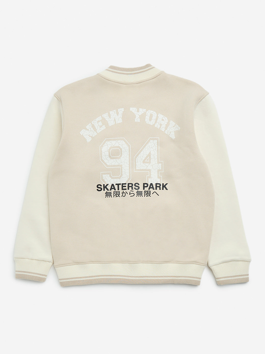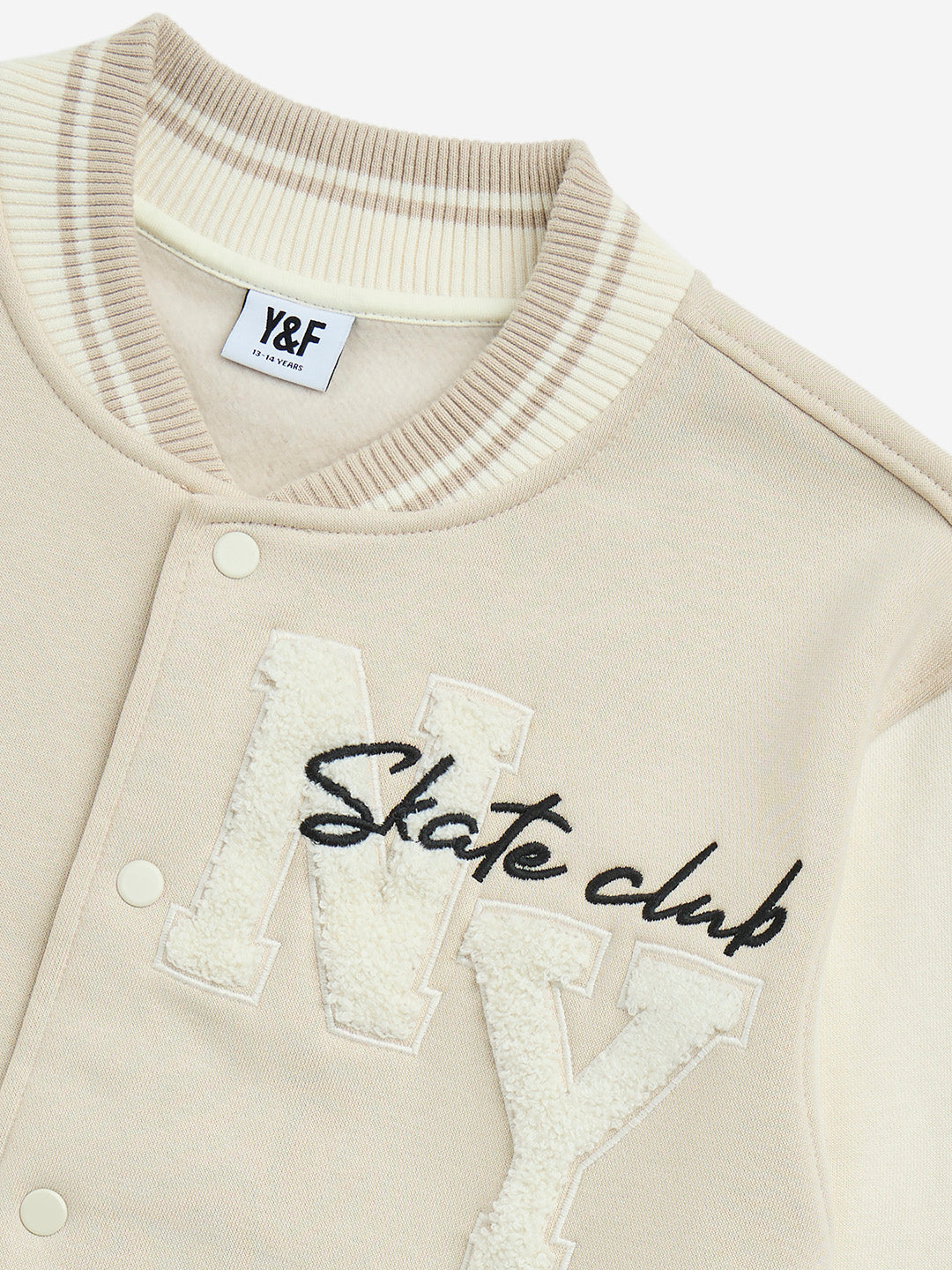 Y&F Kids Beige Text Design Cotton-Blend Varsity Jacket