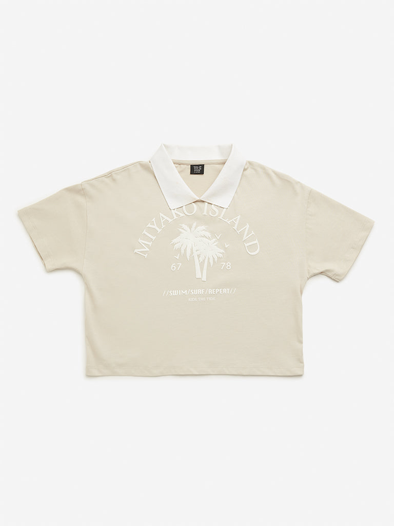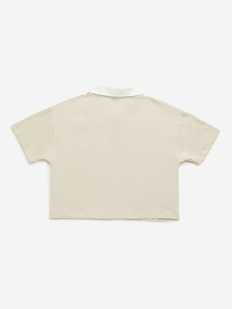 Y&F Kids Beige Text Design Polo Crop Cotton T-Shirt