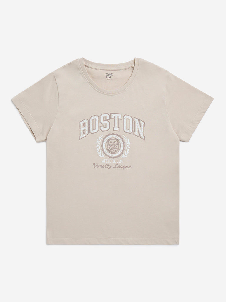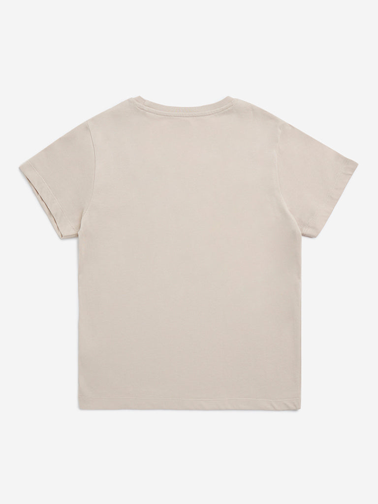 Y&F Kids Beige Text Embroidered Cotton T-Shirt