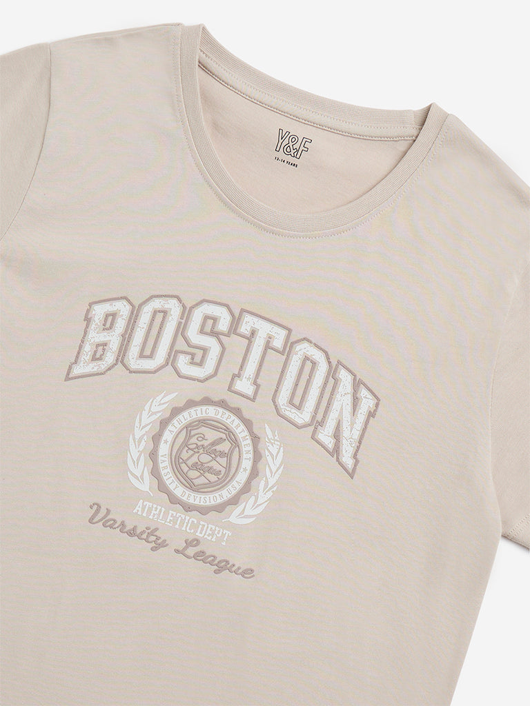 This beige t-shirt from Y&F Kids is styled with text embroidery at the front for a trendy touch. Milled from pure cotton for all-day comfort. it features a classic round neck and short sleeves.