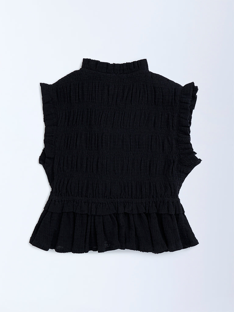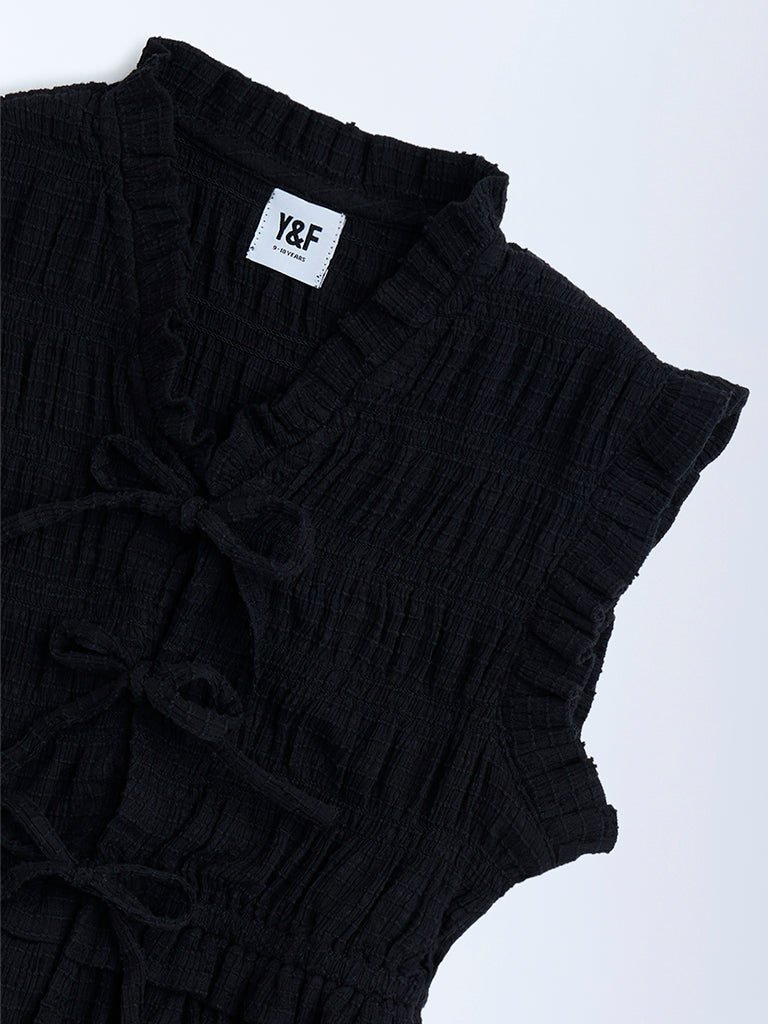 A stylish pick for everyday wear. this black cotton top from Y&F Kids is designed with a V-neckline and knot detailing along the front. The sleeveless silhouette is finished with ruched accents and a flared hem. adding both texture and charm.