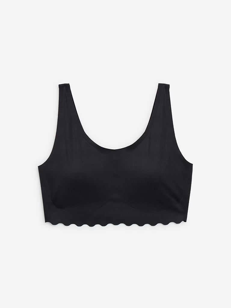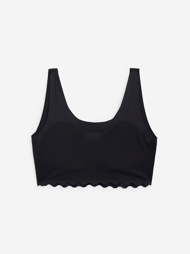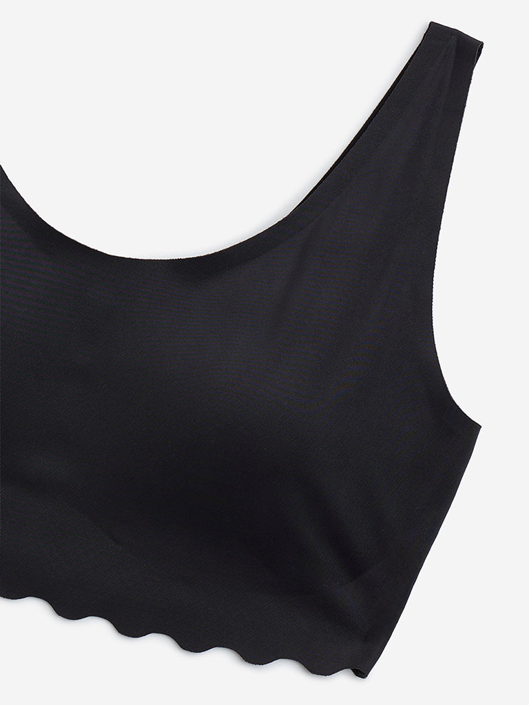 Y&F Kids presents this black invisible crop top. crafted from high-quality fabric for an ultra-soft feel against the skin. Designed for a seamless and undetectable finish under clothing. it features lightly padded cups for gentle support. A delicate scalloped hem adds a stylish touch.