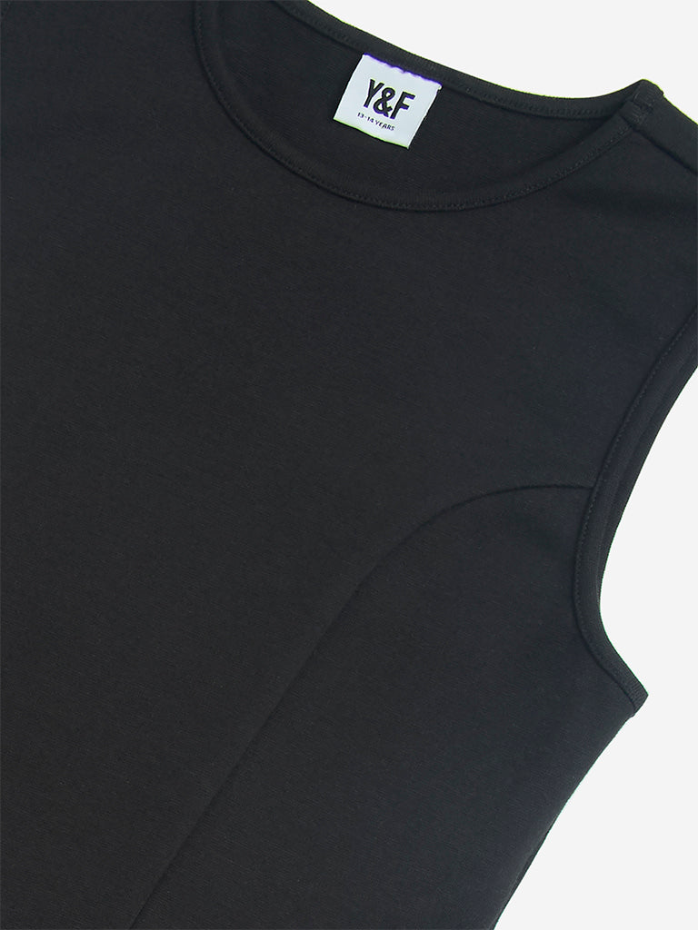This black A-line dress by Y&F Kids is crafted from a soft cotton blend for a comfortable feel. Featuring a classic round neck and a sleeveless cut. its pleated design adds a stylish flair. making it a perfect pick for any occasion.