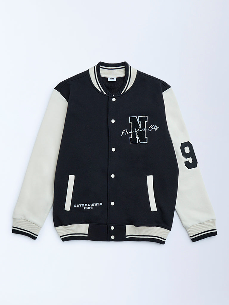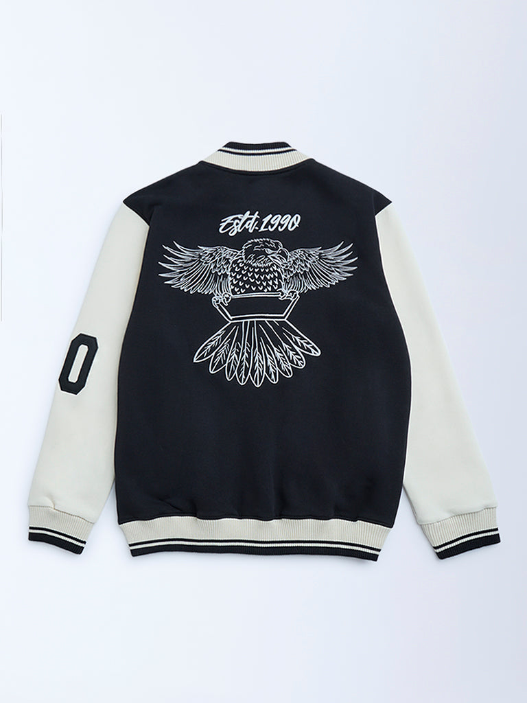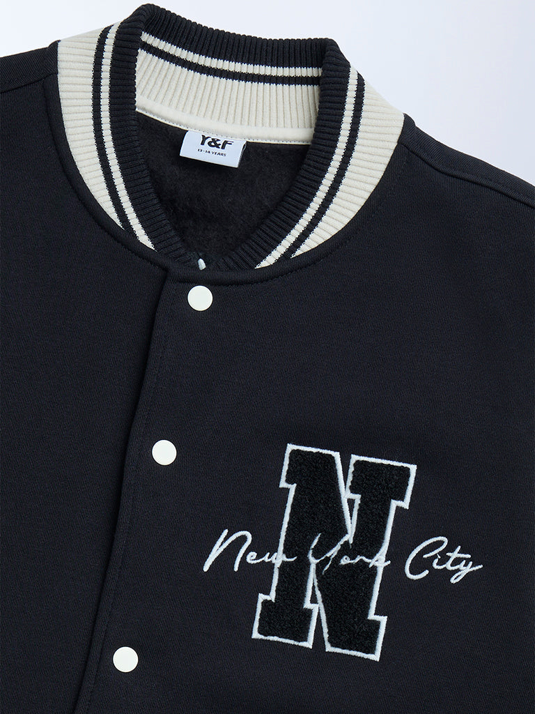 Y&F Kids Black Printed Cotton-Blend Varsity Jacket
