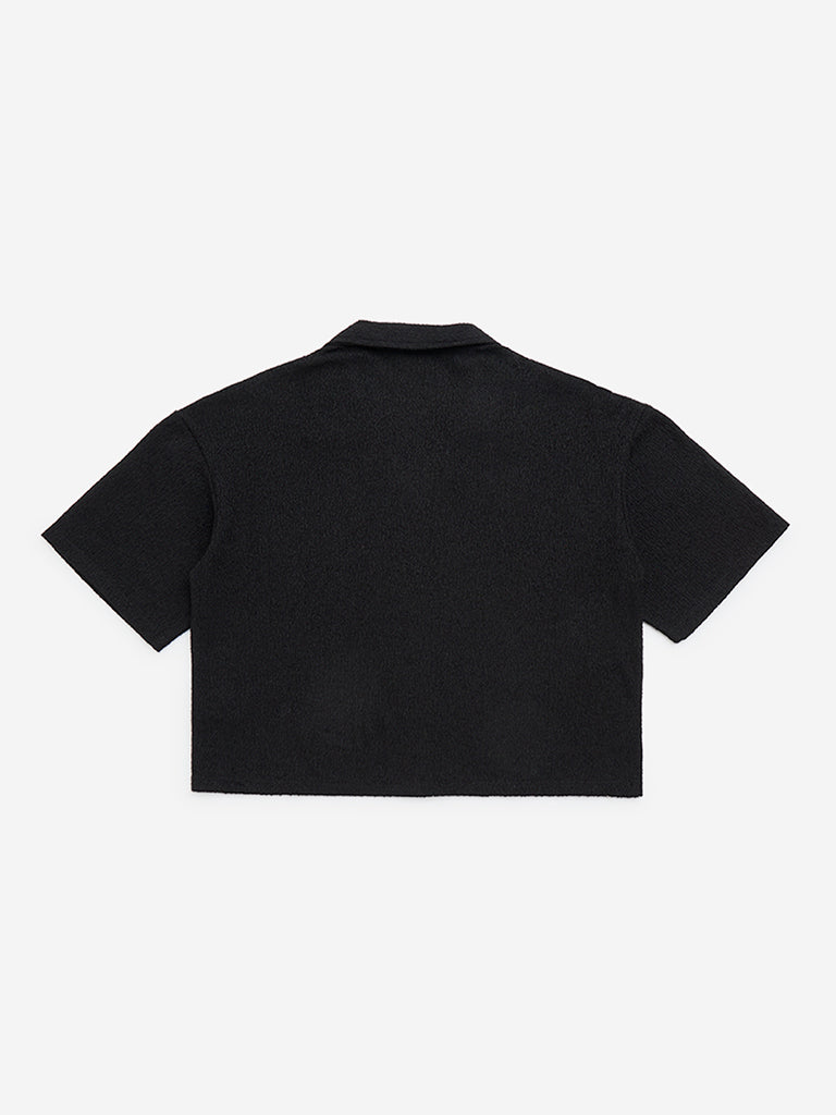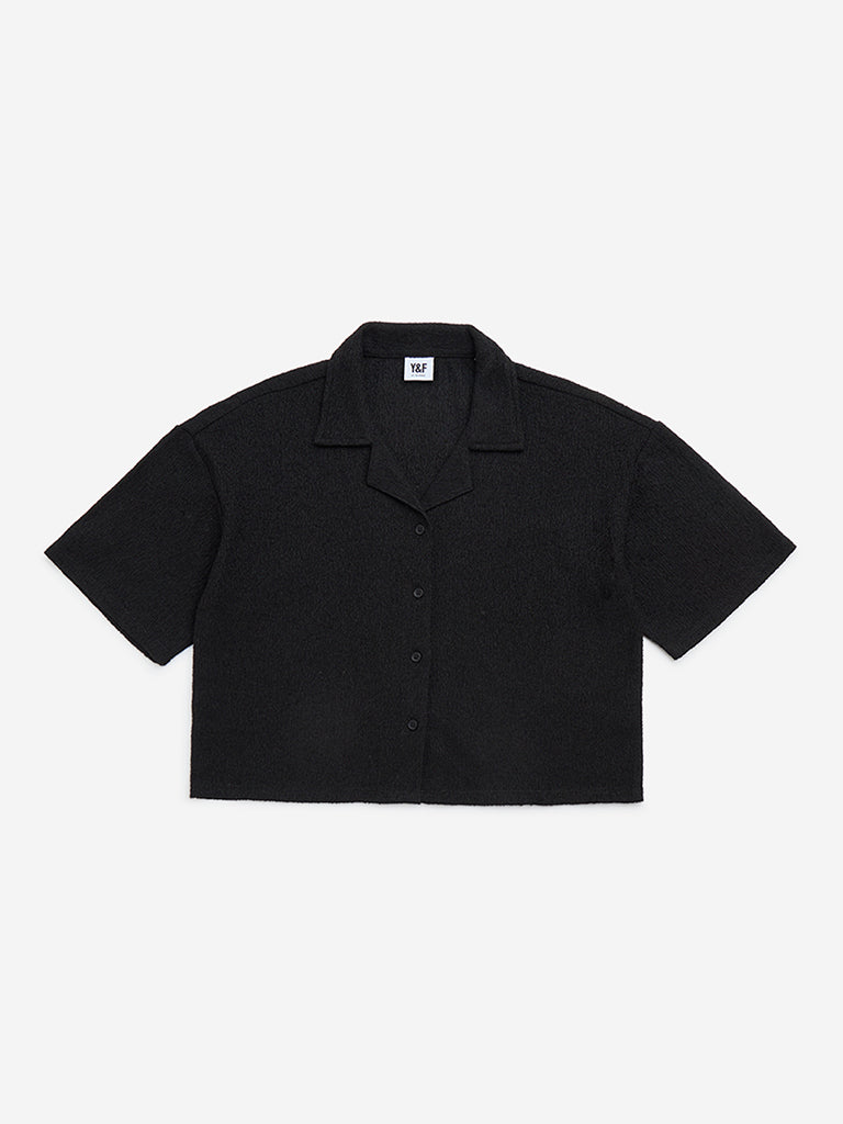 Y&F Kids launches this black shirt in a self-textured profile. Woven from a cotton-blend material. it features a camp collar that extends to a button-up front and short sleeves.
