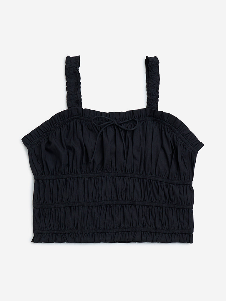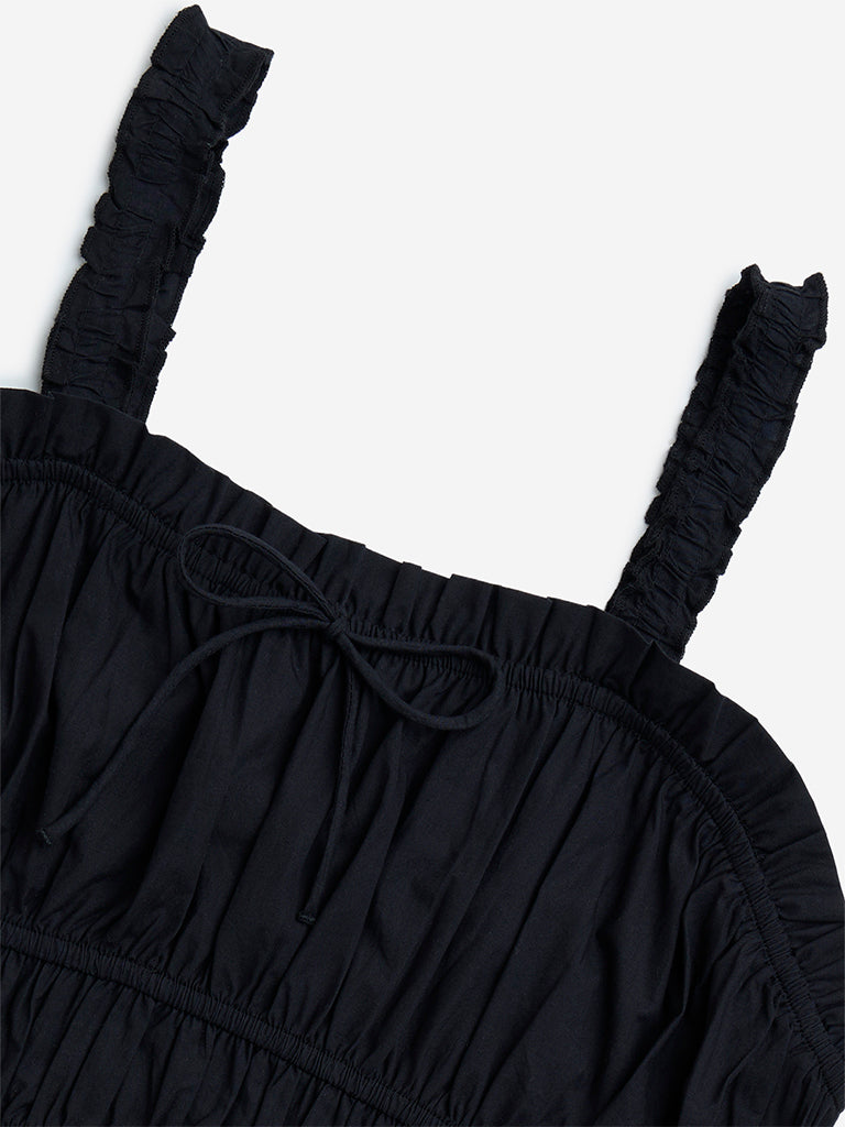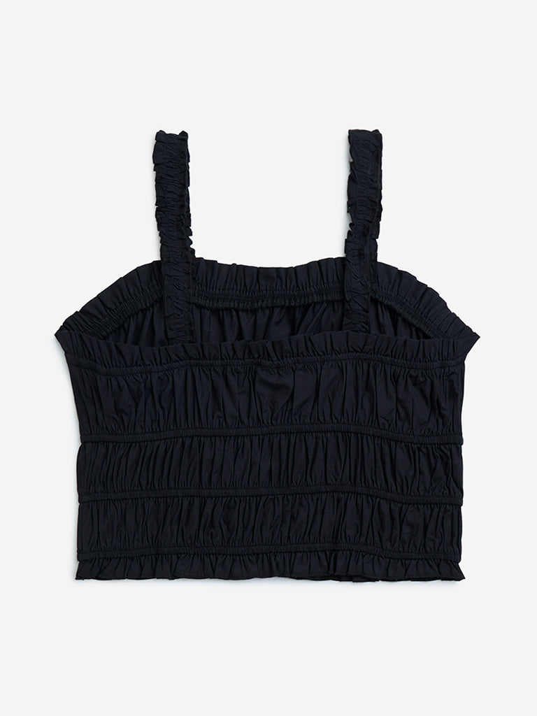 This black top from Y&F Kids is created from pure cotton and features a smocked bodice that ensures a snug fit. The sweetheart neck and ruched shoulder straps add a charming touch of style and comfort.