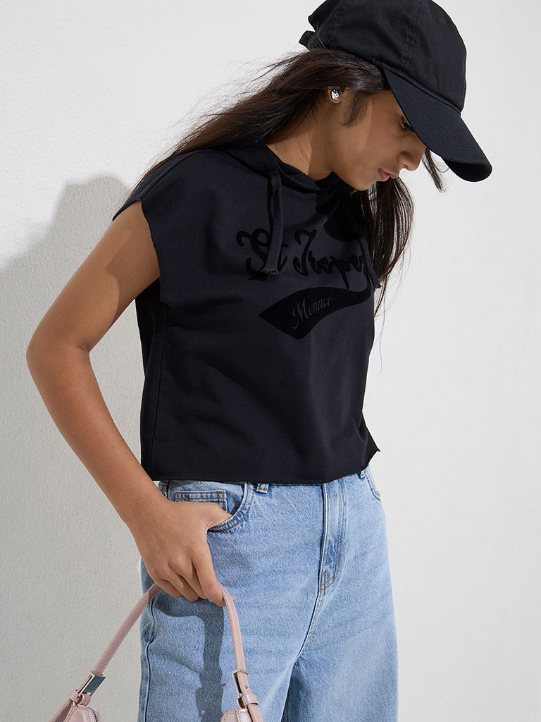 This black hoodie from Y&F Kids is milled from a cotton-rich fabric for superior comfort. Designed with bold text prints on the front. it features a hooded neckline with drawstring details and cap sleeves for a relaxed fit.