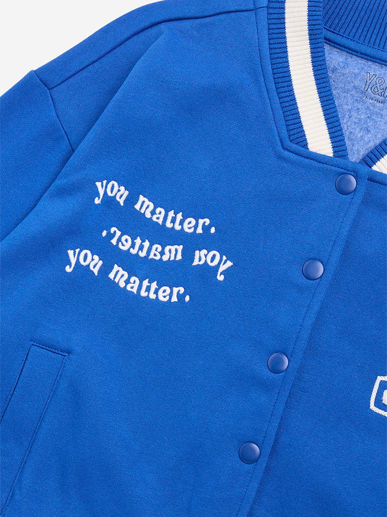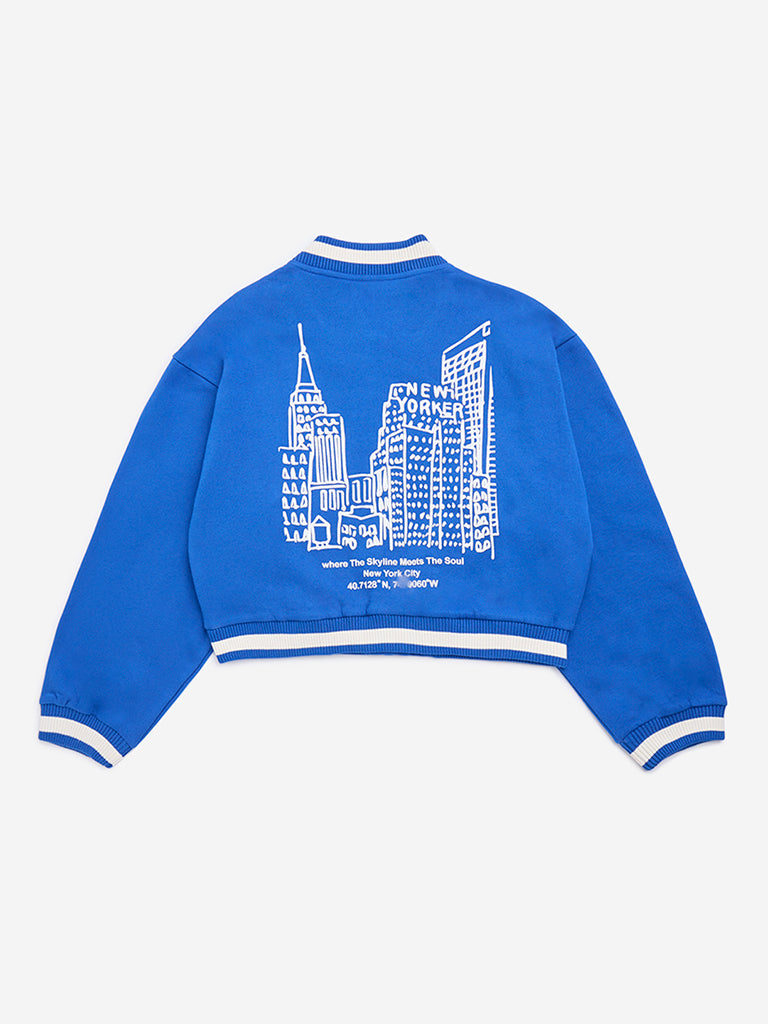 Y&F Kids Blue Cityscape Design Cotton-Blend Varsity Jacket