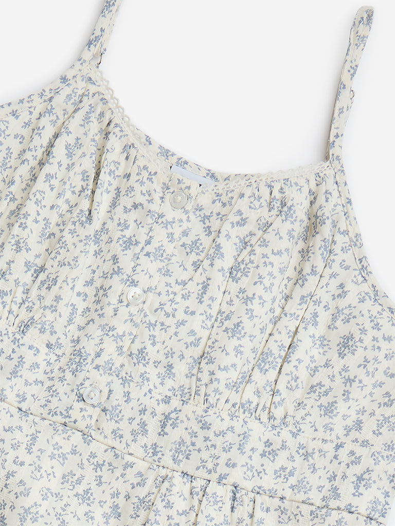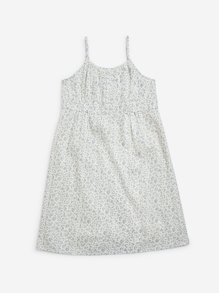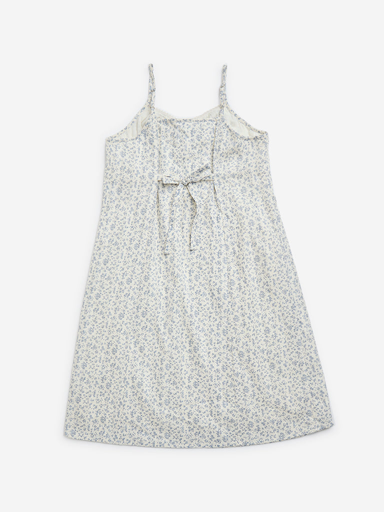 This blue dress from Y&F Kids is crafted from pure cotton and adorned with delicate floral motifs. Designed in a breezy A-line silhouette. it features a V-neck with crochet detailing. adjustable straps. a button placket. and a tie-up back for a cinched fit.