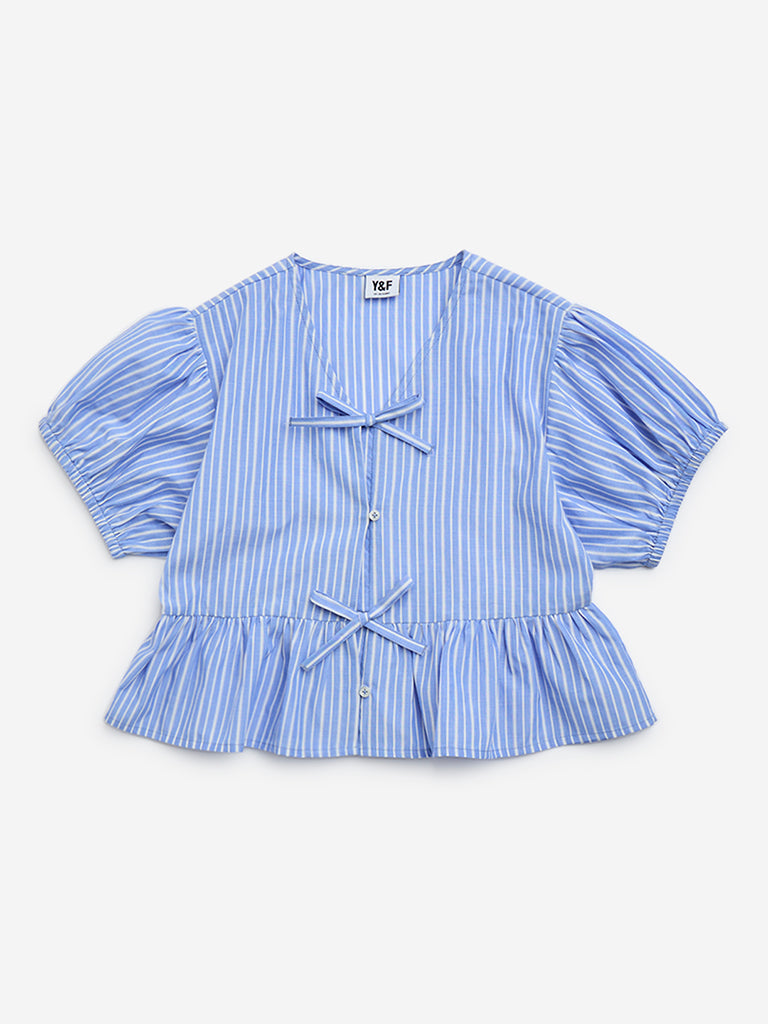 This blue top from Y&F Kids is a delightful choice. showcasing classic stripes and charming bow detailing at the front. Crafted from a soft cotton-blend fabric. it features a flattering V-neck and puff sleeves for a stylish yet playful touch.