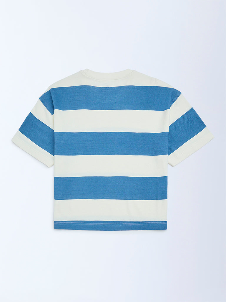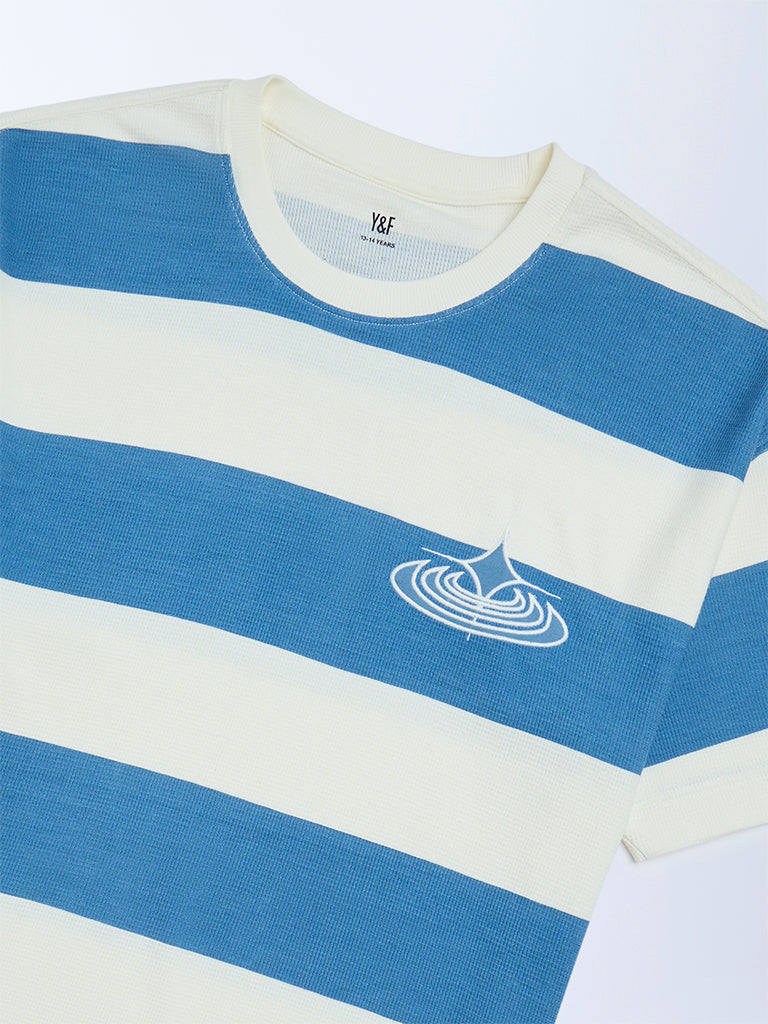 Y&F Kids introduces this blue t-shirt that brings a fresh. everyday charm. Soft and breathable in pure cotton. it features a classic crew neck and short sleeves for easy movement. The bold stripes give it a cheerful. sporty feel perfect for active kids and sunny-day plans.