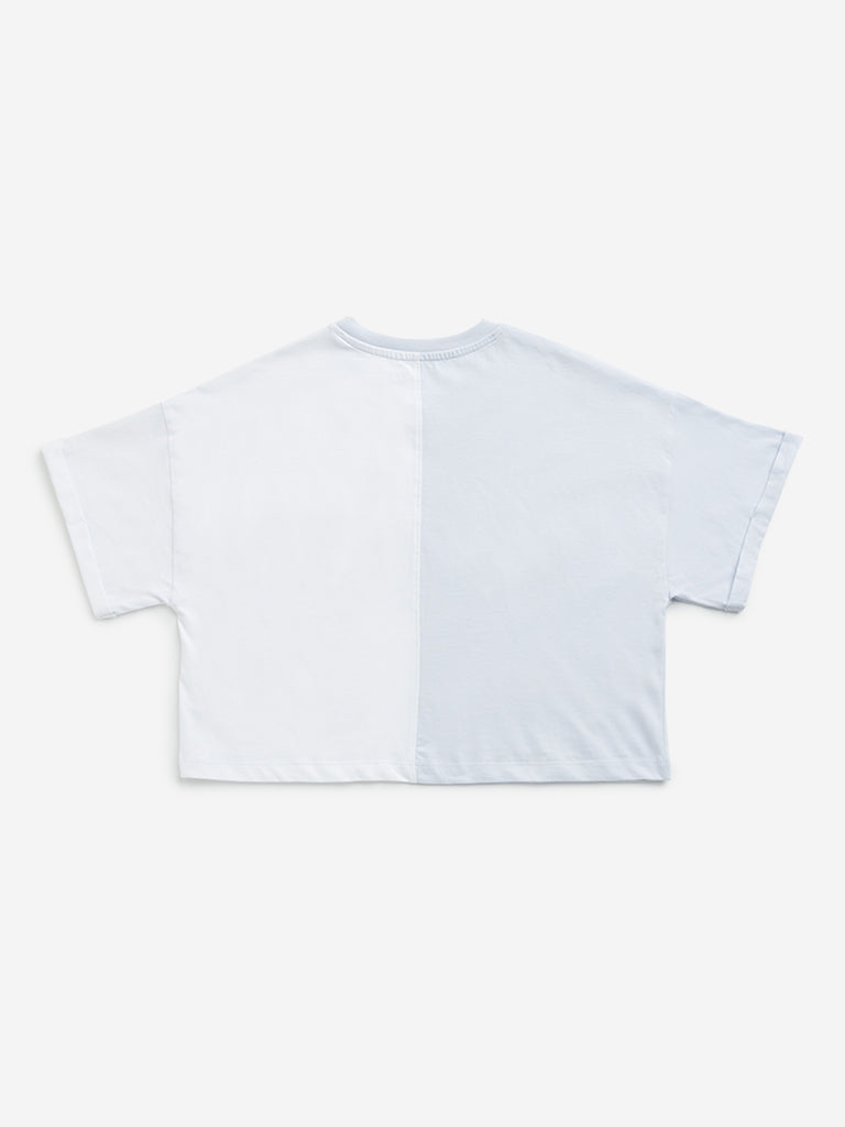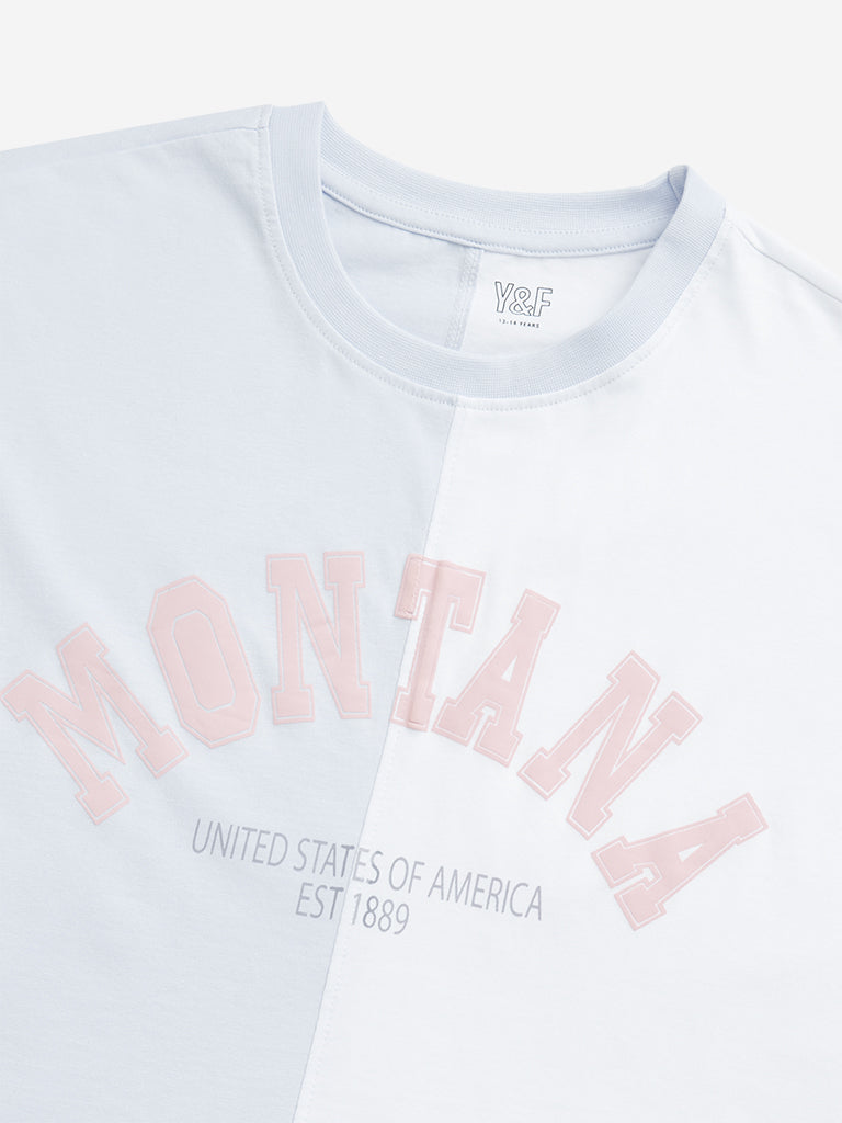 Crafted from a soft fabric. this blue cropped top from Y&F kids features a stylish text embossed print. Its round neckline and short sleeves add a comforting touch to the garment. ensuring both style and comfort for your little one.