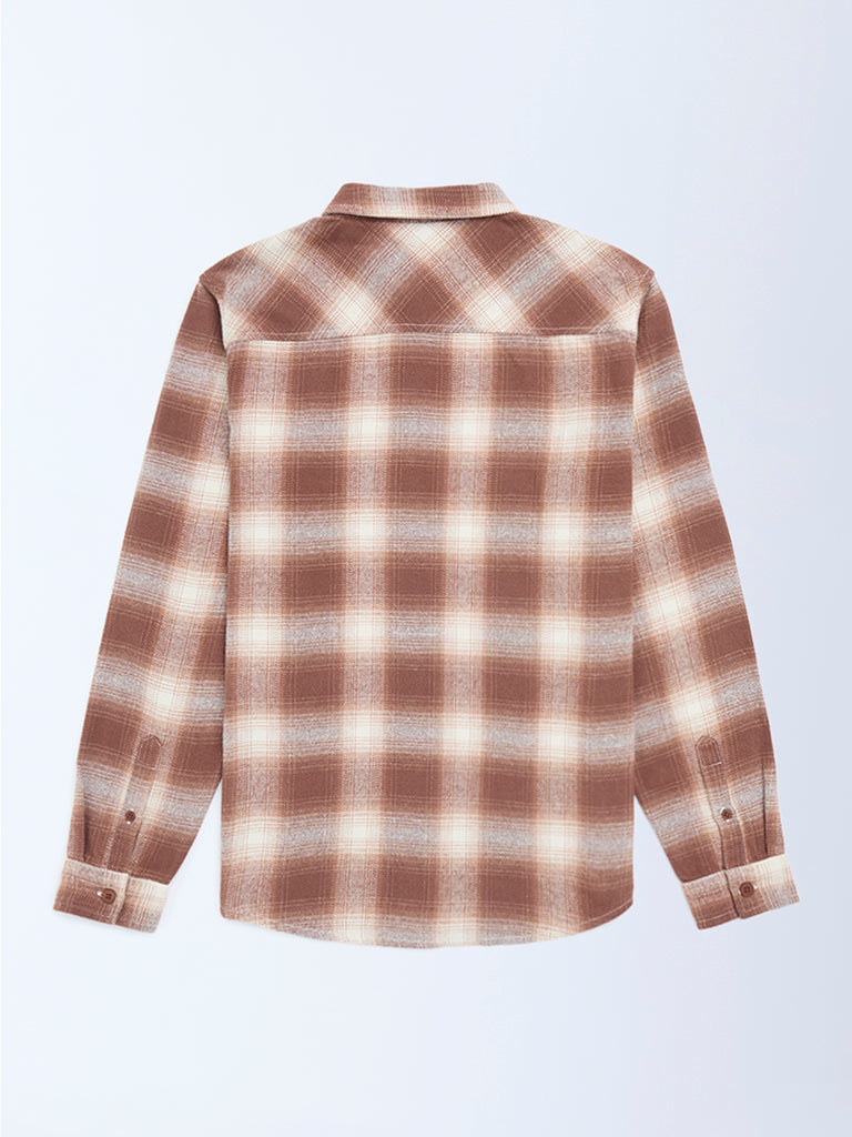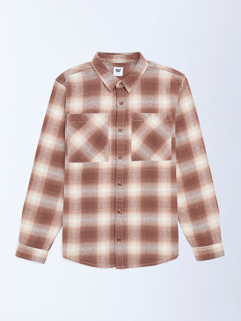 Designed for easy layering. this brown checkered shirt from Y&F Kids blends comfort with everyday style. Crafted from pure cotton for a soft and breathable feel. it is finished with a structured collar. button-up front and full sleeves. The twin flap pockets adds a functional finish. making this piece an effortless choice for casual dressing.
