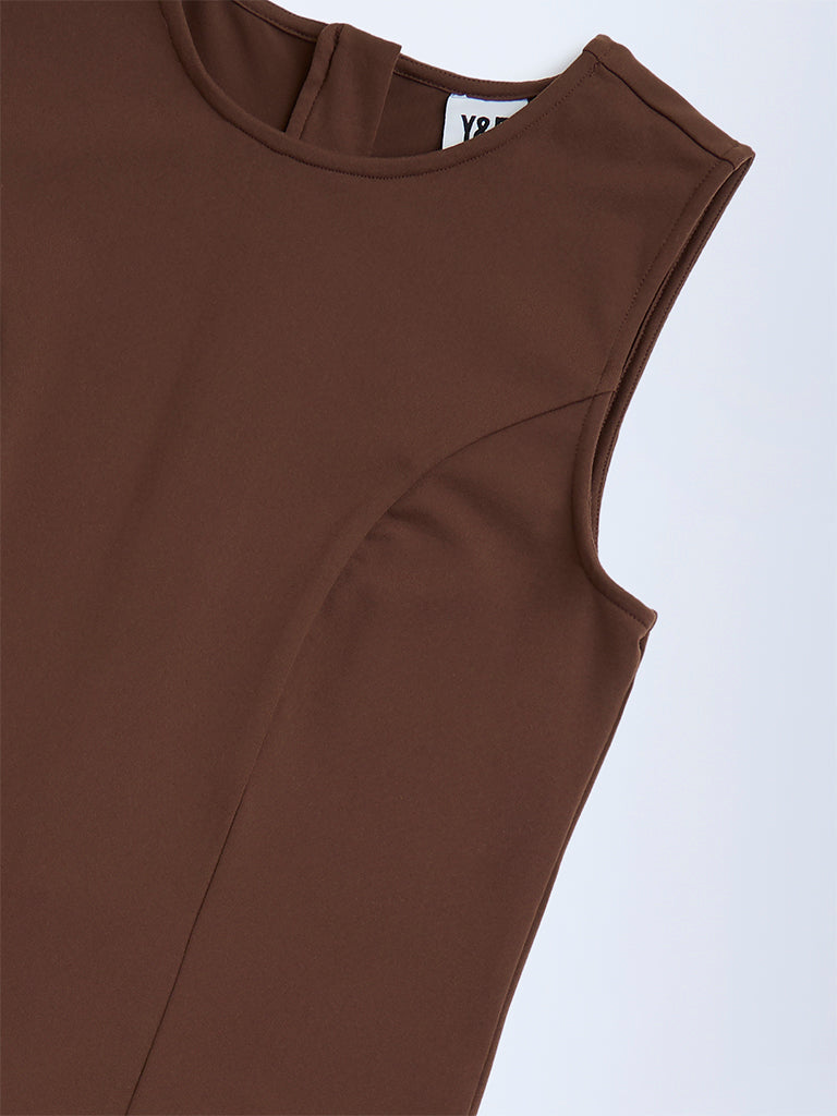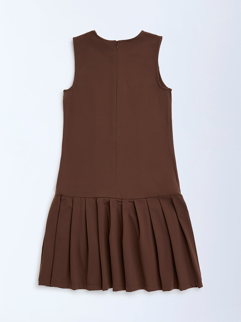 Perfect for polished party looks. this brown dress from Y&F Kids features a chic drop-waist silhouette with a modern flair. Woven from a premium fabric for a super-soft feel. it’s styled with a round neck. sleeveless cut. and neatly structured pleats along the hem. A concealed back zipper makes dressing up effortless.